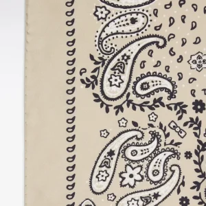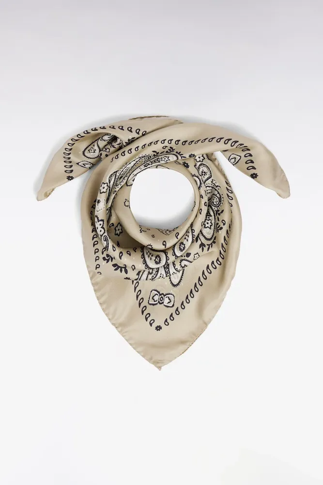 Idéal pour parfaire une tenue avec élégance, ce foulard à motif bandana, dans lequel se cache notre emblème, est réalisé dans un luxueux twill de soie pour un porter léger et confortable. Noué dans les cheveux, autour du cou ou pourquoi pas sur votre sac, ce foulard ne vous quittera plus. Sa finition roulottée et son format carré en font un accessoire au chic discret facile à porter au quotidien. Offert en beige champagne ou en vert.