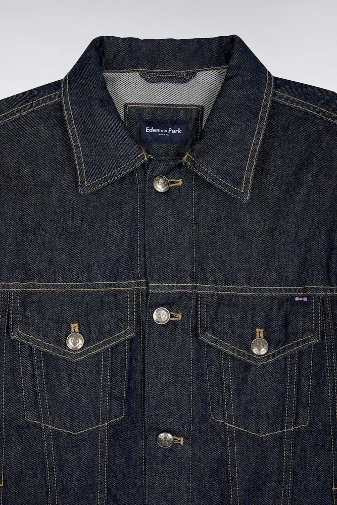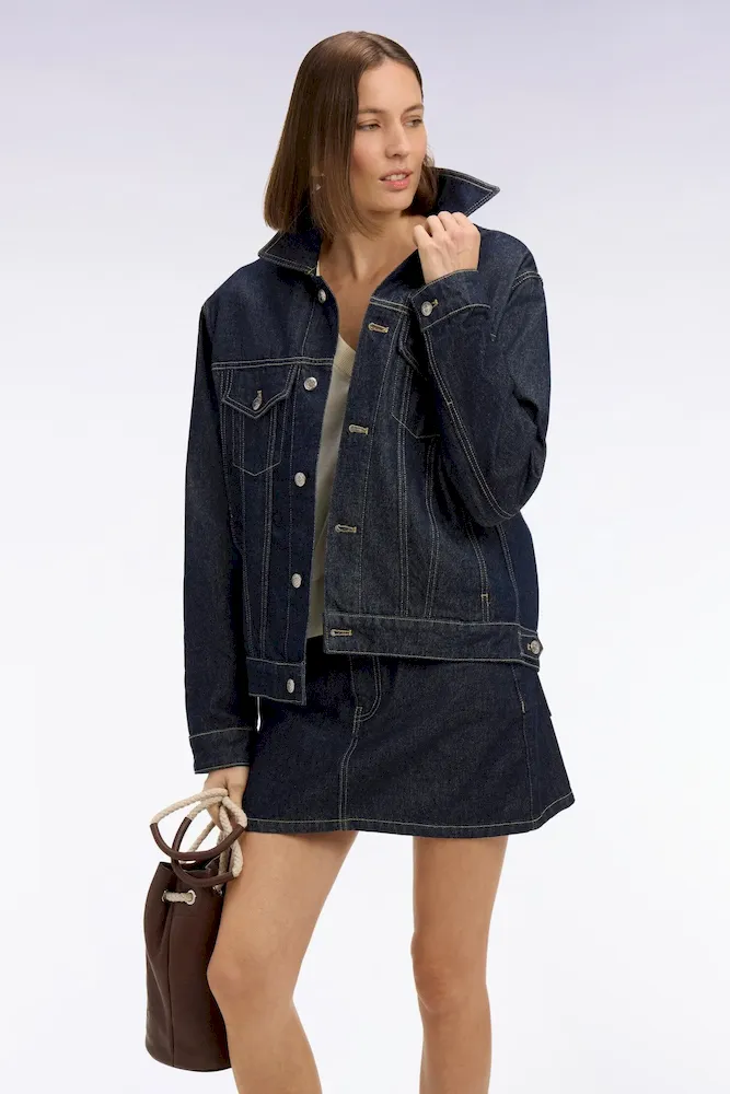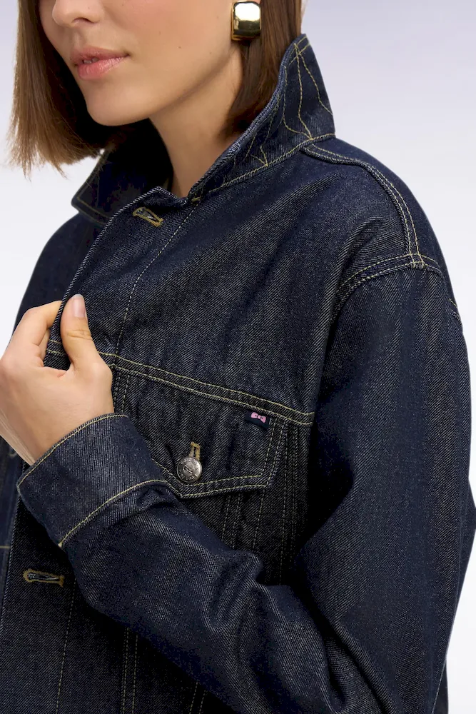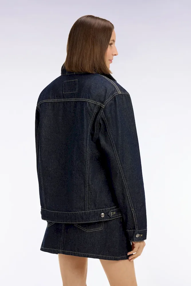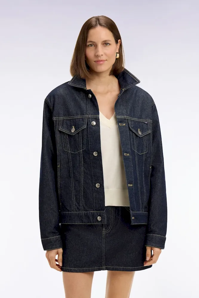 Ce blouson en denim 100% coton conjugue confort et élégance printanière. Il se distingue par ses poches poitrine parfaitement intégrées dans ses découpes qui sculptent naturellement la silhouette. Les détails raffinés typique de notre Maison, comme sa griffe nœud papillon et ses boutons personnalisés du nom de notre Maison, signent son caractère unique. Ce blouson en denim brut à la coupe oversized s’intègre parfaitement à une allure printanière décontractée tout en facilitant les jeux de superposition.