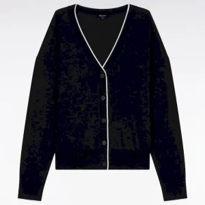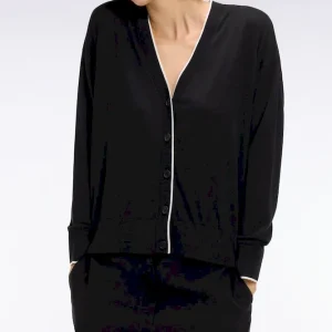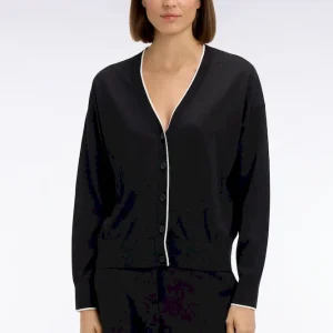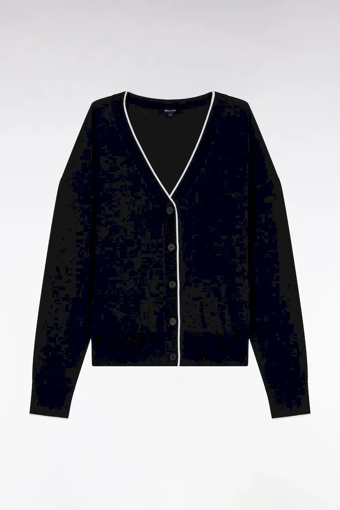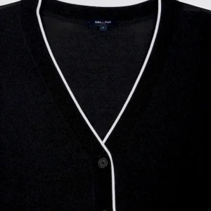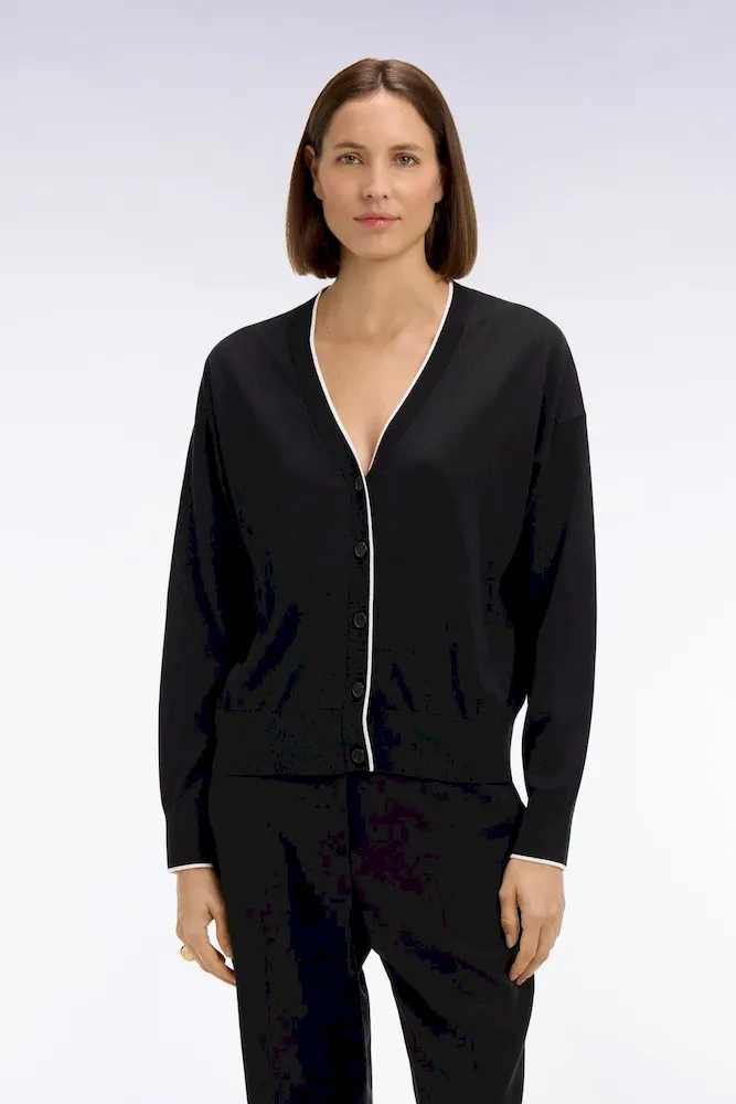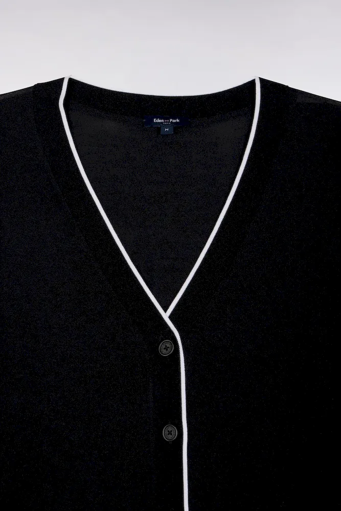 Notre cardigan col V, confectionné dans un mélange fluide et léger de Tencel, coton et soie, séduit par sa douceur exceptionnelle et son tomber. Sa coupe relaxed assure une allure effortless, tandis que le liseré contrasté en bordure d’encolure et patte de boutonnage structure délicatement la silhouette, se déclinant en noir ou en blanc selon le coloris choisi pour renforcer le caractère graphique de ce cardigan. À porter sur un débardeur près du corps, son pull à manches courtes dans l’un ou l’autre des coloris ou à même la peau pour apprécier toute sa douceur. Cardigan femme offert en coloris noir ou blanc.