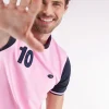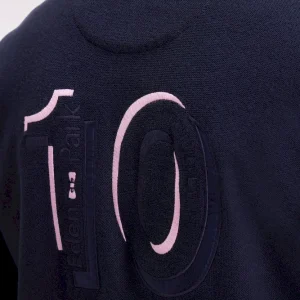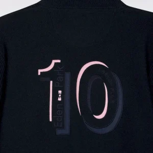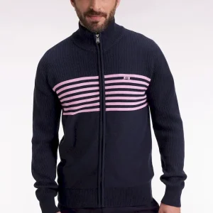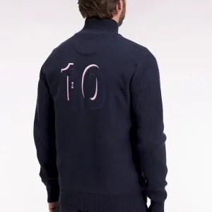 Ce cardigan zippé à col montant à l’intérieur contrasté, révélé porté ouvert, impose son style graphique avec son jeu de rayures horizontales contrastées sur la poitrine. Tricoté en coton, il mêle maille côtelée sur les manches et jersey sur le corps pour une allure structurée et confortable. Au dos, ce pull à col montant zippé présente une large broderie, hommage subtil au maillot de rugby de notre fondateur, Franck Mesnel. Une allure singulière, reconnaissable : la marque d’une élégance sport-chic à la française