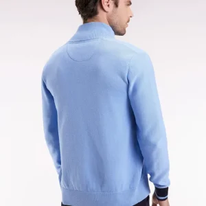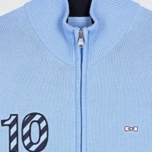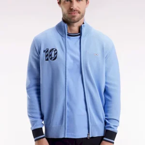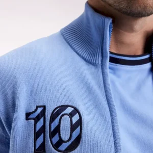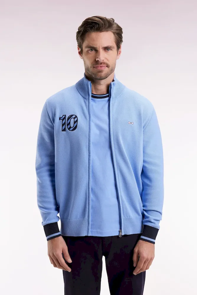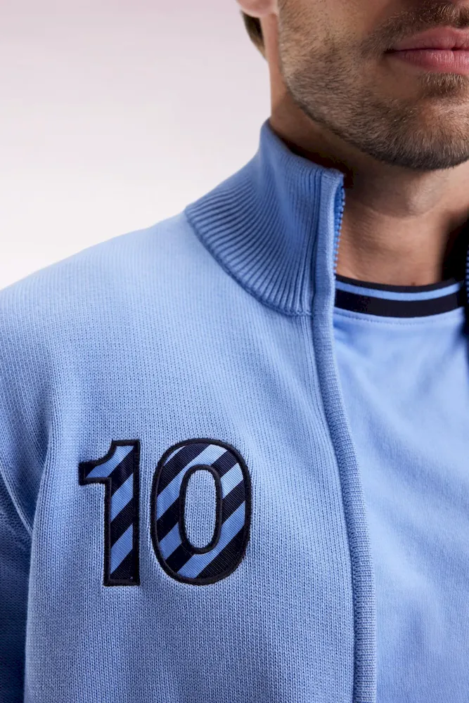 Ce cardigan zippé à col montant affirme son caractère sport-chic à travers ses jeux de textures entre point jersey et jersey envers. Ses bords-côtes manches et sa broderie 10 rehaussée d’une application de tissu cravate apporte une touche graphique discrète. Une pièce confortable et soignée, pensée pour rythmer les silhouettes du quotidien