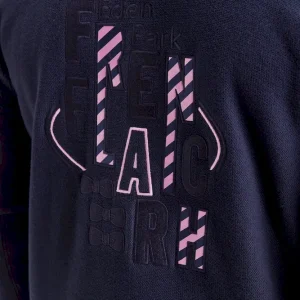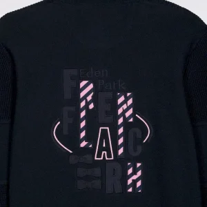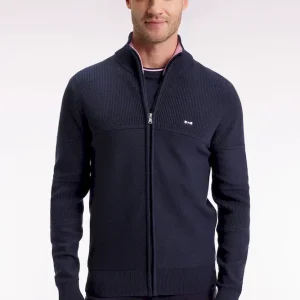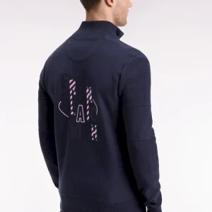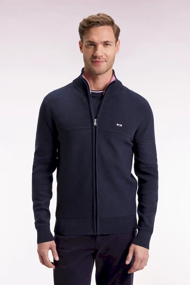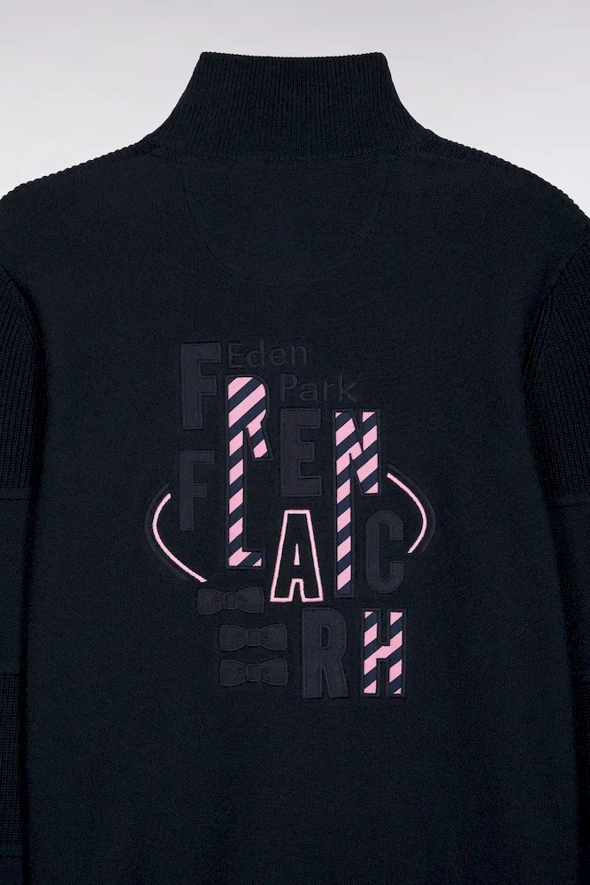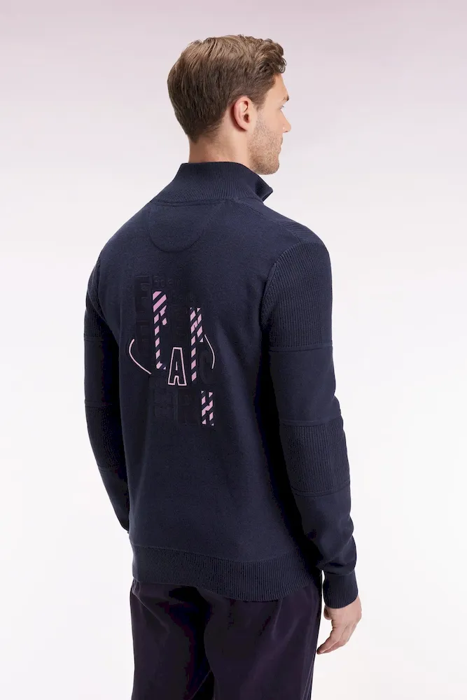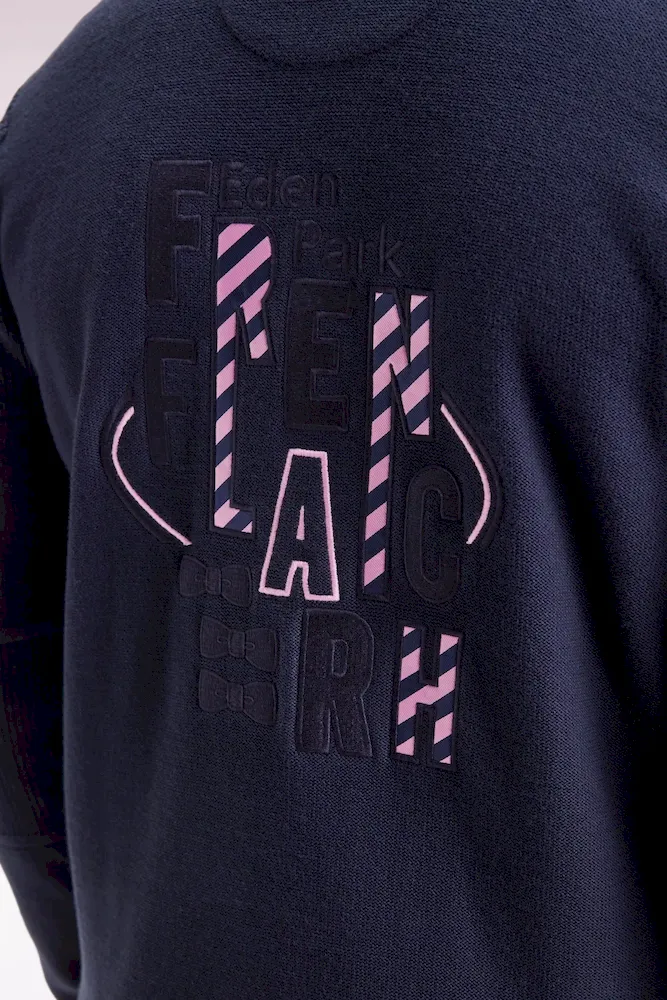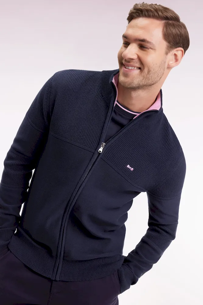 Ce cardigan à zip droit en pur coton tricoté dans un mélange de jersey et côtes anglaise incarne l’esprit sport-chic si propre à Eden Park. Au dos, sa large broderie French Flair est rehaussée d’un tissu cravate rayé : un détail typique du vestiaire de notre maison de mode