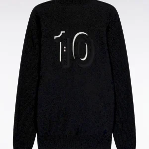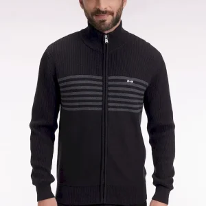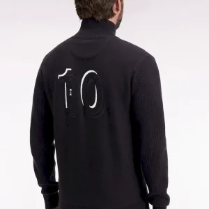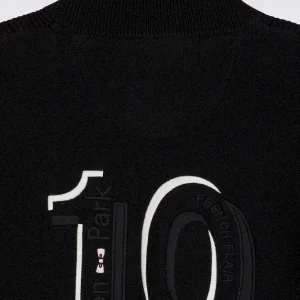 Ce cardigan zippé à col montant à l’intérieur contrasté, révélé porté ouvert, impose son style graphique avec son jeu de rayures horizontales contrastées sur la poitrine. Tricoté en coton, il mêle maille côtelée sur les manches et jersey sur le corps pour une allure structurée et confortable. Au dos, ce pull à col montant zippé présente une large broderie, hommage subtil au maillot de rugby de notre fondateur, Franck Mesnel. Une allure singulière, reconnaissable : la marque d’une élégance sport-chic à la française
