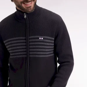 Ce cardigan zippé à col montant à l’intérieur contrasté, révélé porté ouvert, impose son style graphique avec son jeu de rayures horizontales contrastées sur la poitrine. Tricoté en coton, il mêle maille côtelée sur les manches et jersey sur le corps pour une allure structurée et confortable. Au dos, ce pull à col montant zippé présente une large broderie, hommage subtil au maillot de rugby de notre fondateur, Franck Mesnel. Une allure singulière, reconnaissable : la marque d’une élégance sport-chic à la française