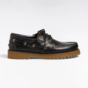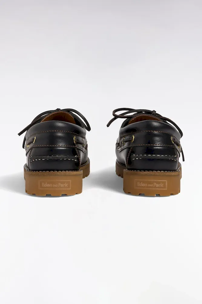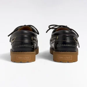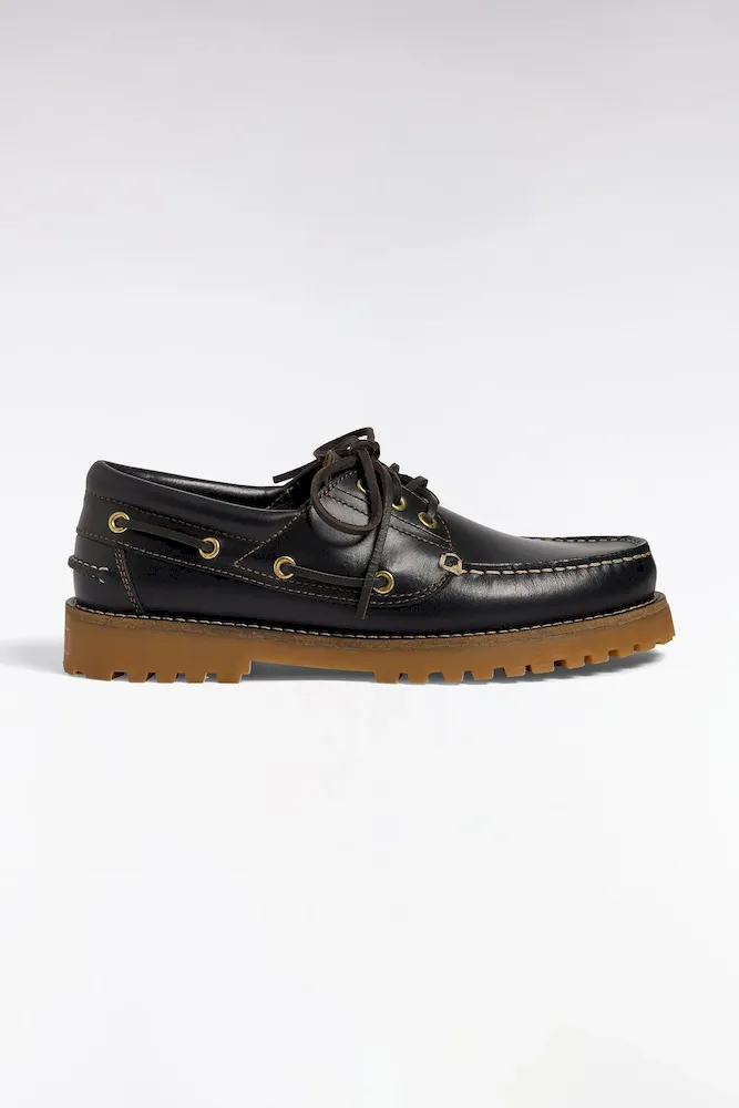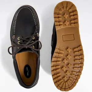 Chaussures bateau en cuir lisse noir semelles beige