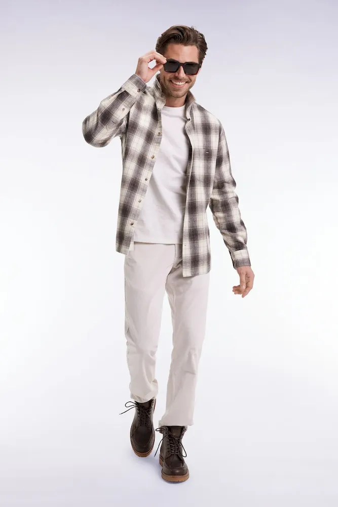 Cette chemise masculine en tissu japonais 100% coton à motif carreaux conjugue authenticité et modernité. Déclinée dans une coupe droite regular, elle affirme son caractère par son motif graphique travaillé dans des teintes raffinées faciles à associer à vos favoris. Le nœud papillon brodé sur la poche poitrine signe discrètement son appartenance au vestiaire Eden Park. Sa coupe minimaliste à pant droit en fait une surchemise idéale pour parfaire vos jeux de superposition au cœur de la saison automne – hiver. Un modèle alliant le confort à un certain sens de l’élégance brute