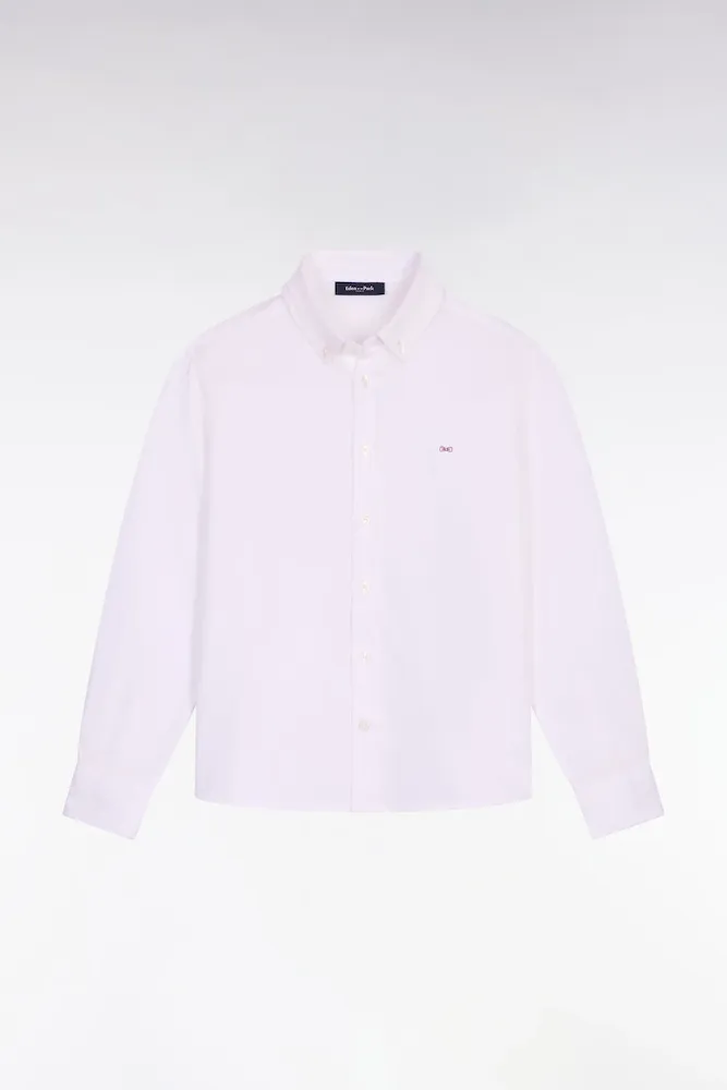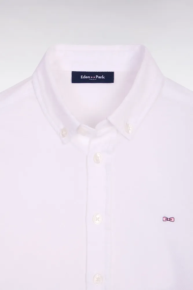 Cette chemise à manches longues pour enfant allie le raffinement d’une coupe habillée au confort du coton. Proposée dans un blanc immaculé, idéal pour le vestiaire cérémonie des plus petits, cette chemise enfant se distingue par sa broderie nœud papillon rose, signature discrète des collections Eden Park et son col classique à pointes boutonnées.