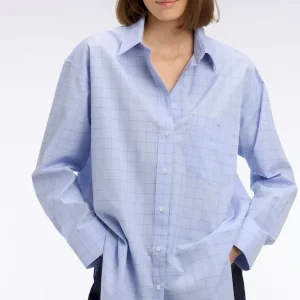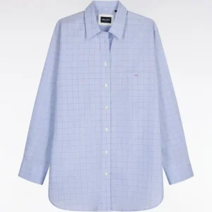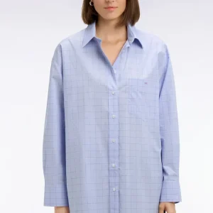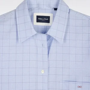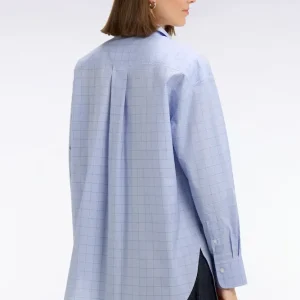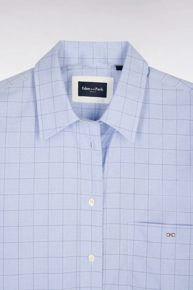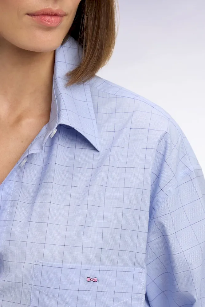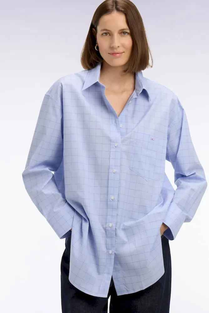 La douceur de la popeline de coton s’associe à une coupe oversized moderne pour cette chemise femme bleu ciel. Pour une touche graphique réinterprétant les pièces phares d’un vestiaire elle se dote de carreaux prince de Galles et d’une poche plaquée. Jean ou pantalon d’inspiration tailleur se marieront à la perfection à cette élégante chemise.