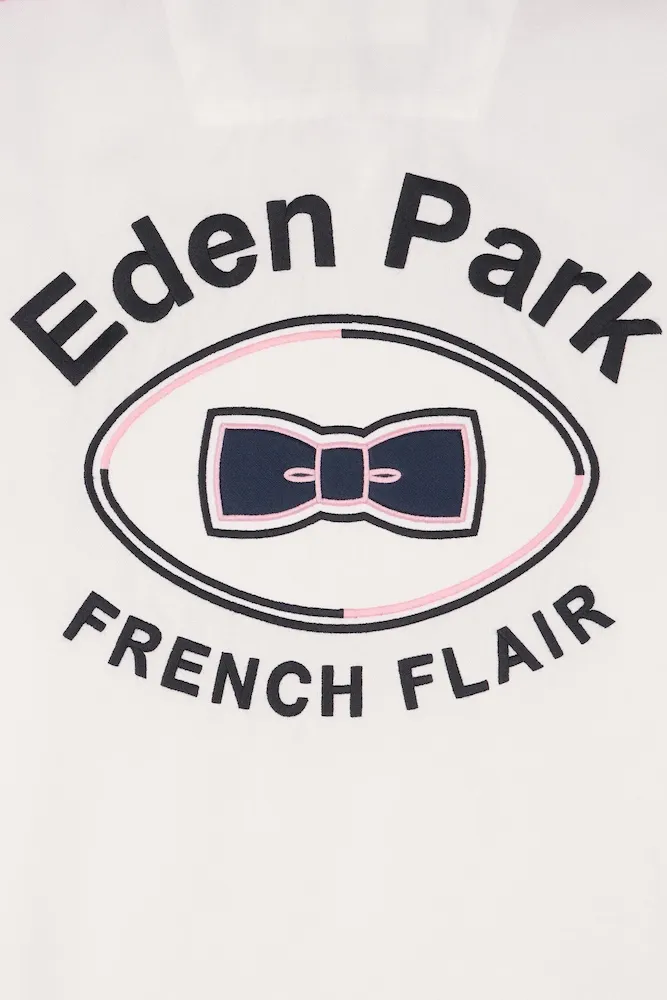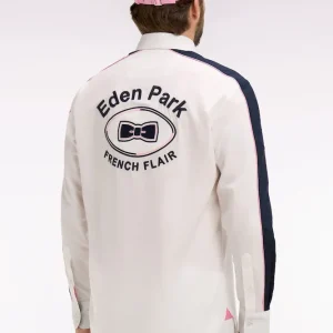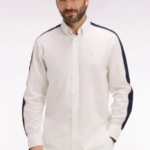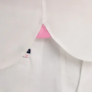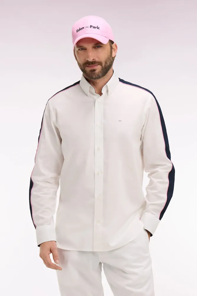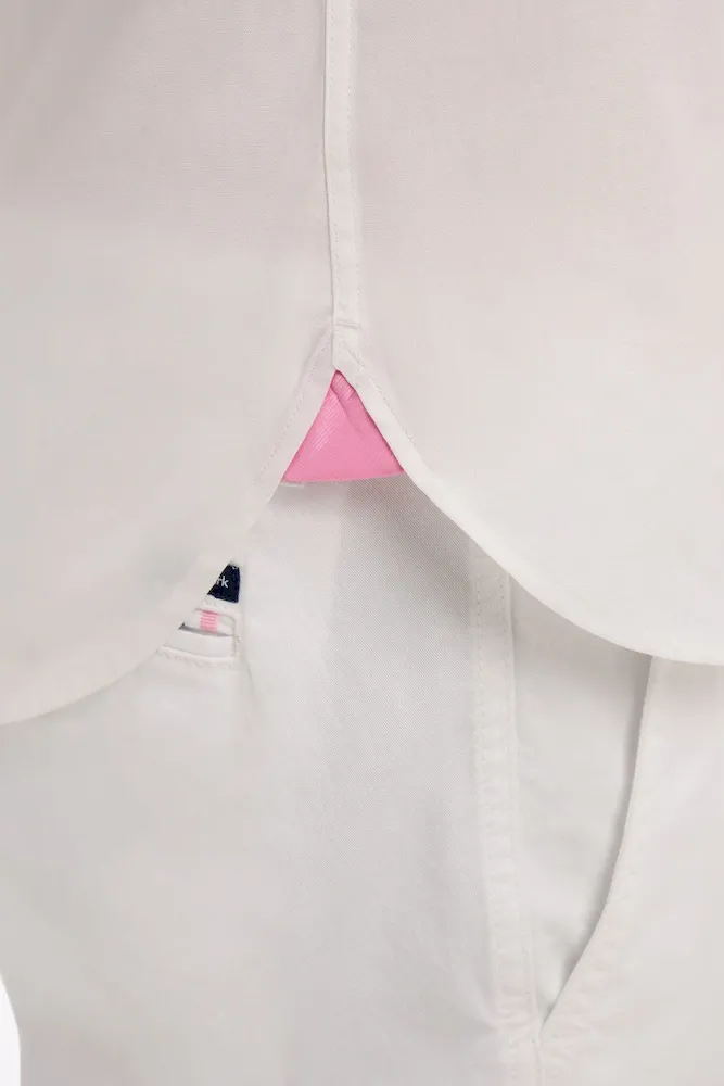 Cette chemise en coton blanc à armure pinpoint associe finesse du tissage et signature identitaire. Sa broderie dos et ses découpes manche expriment l’héritage rugby de notre Maison, toujours revisité dans une version contemporaine. Sa coupe droite assure un porté confortable, tandis que ses passepoils contrastés rose et marine aux manches et à l’intérieur du col apportent un raffinement discret. Une pièce affirmée, parfaite pour une allure sport chic qui ne passe pas inaperçue.
