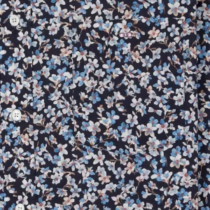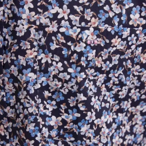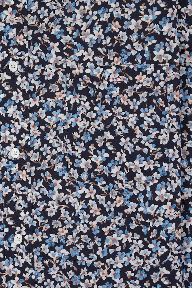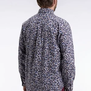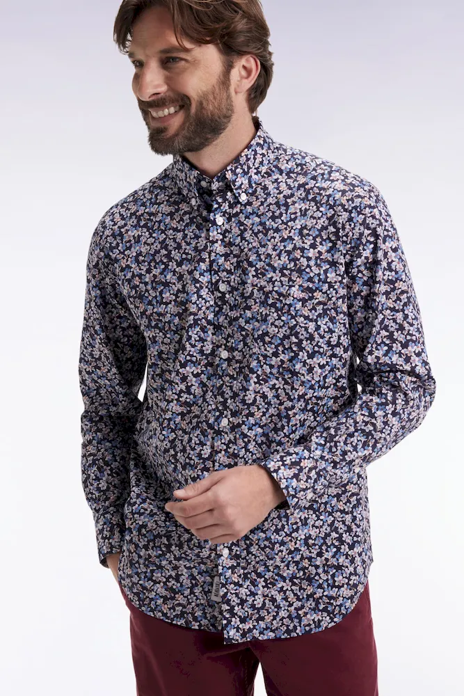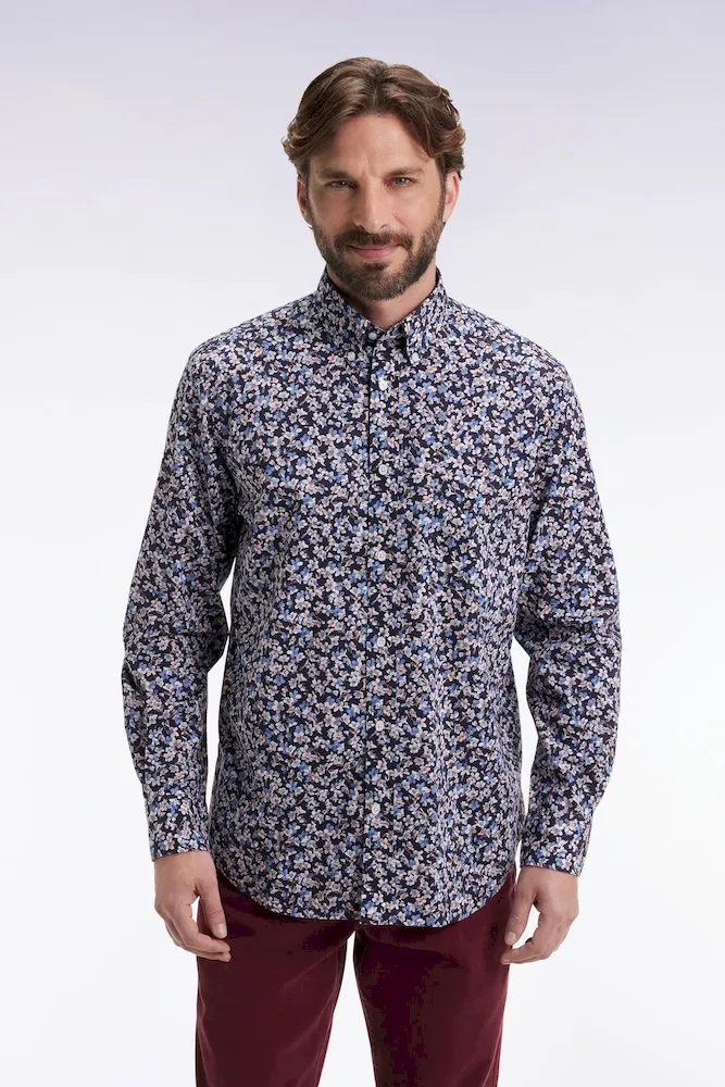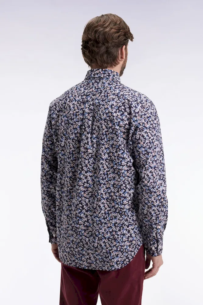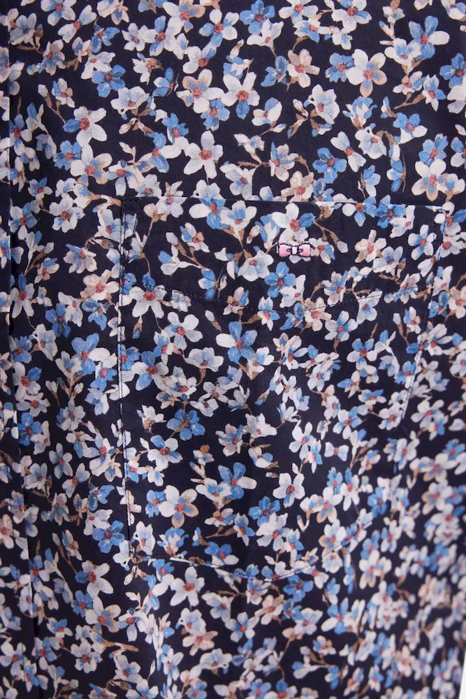 Chemise en popeline de coton à micro-motifs fleurs bleu coupe droite