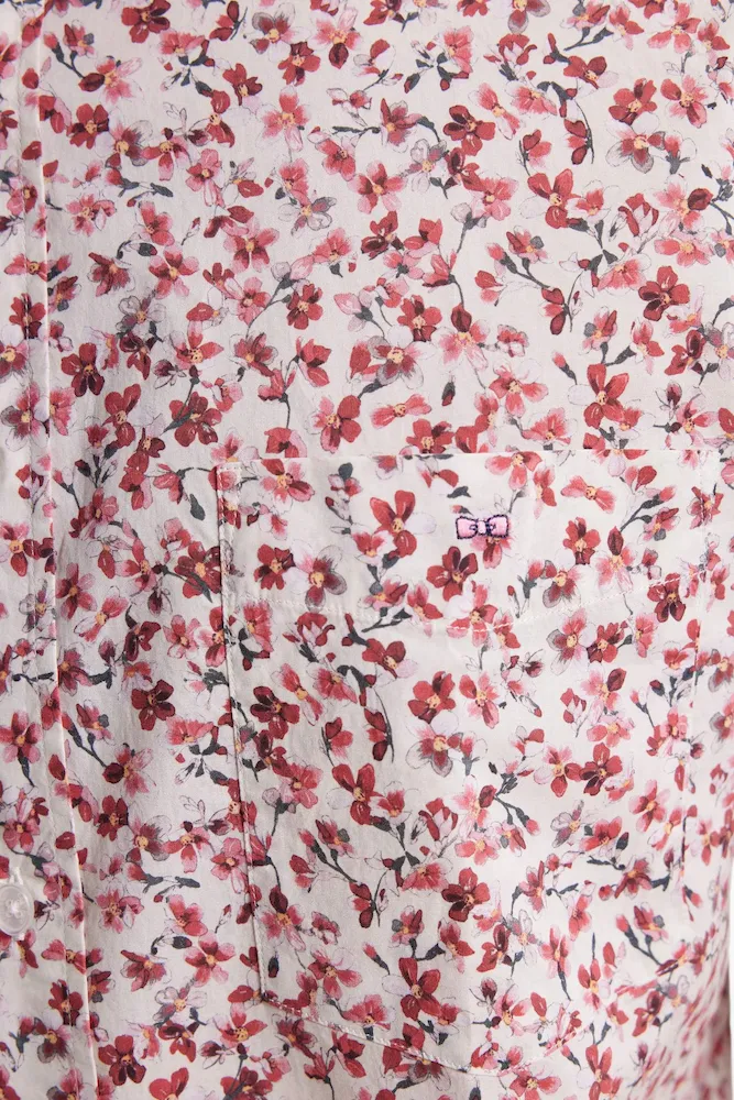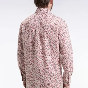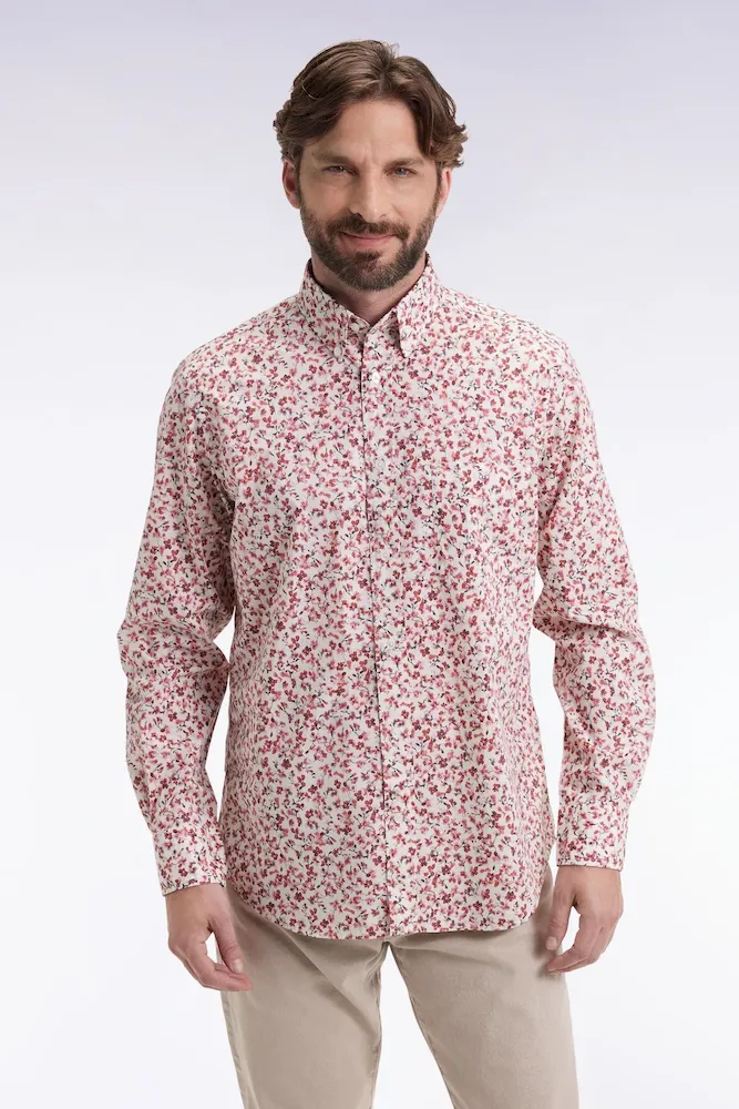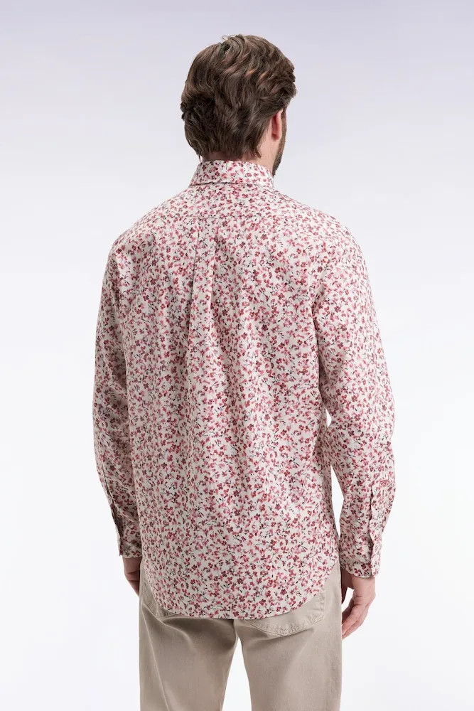 Conçue dans une popeline de coton légère, cette chemise homme à l’imprimé floral raffiné, proposé en rouge sur un fond écru ou en camaïeu de bleus, affiche un style sophistiqué maîtrisé. Le motif, tout en délicatesse, contraste avec sa coupe droite structurée et ses finitions sport-chic : poche plaquée et bouton ovales rugby siglés. Son col à pointes boutonné met en valeur le port de tête, que vous la portiez fermée ou largement entrouverte