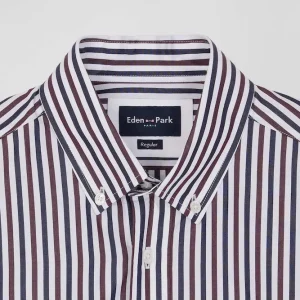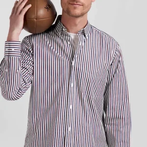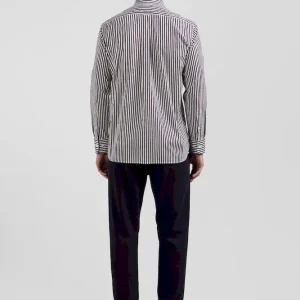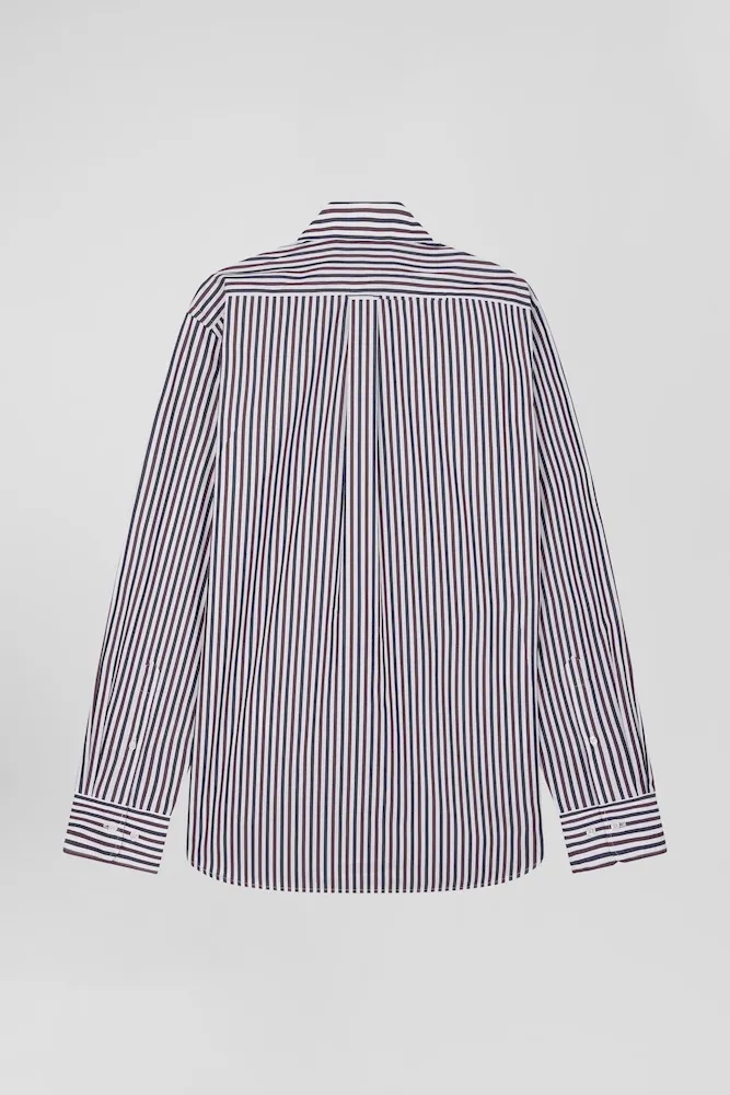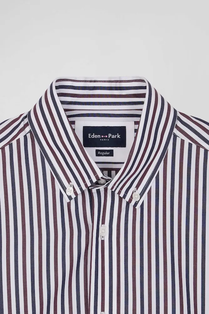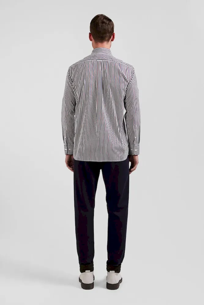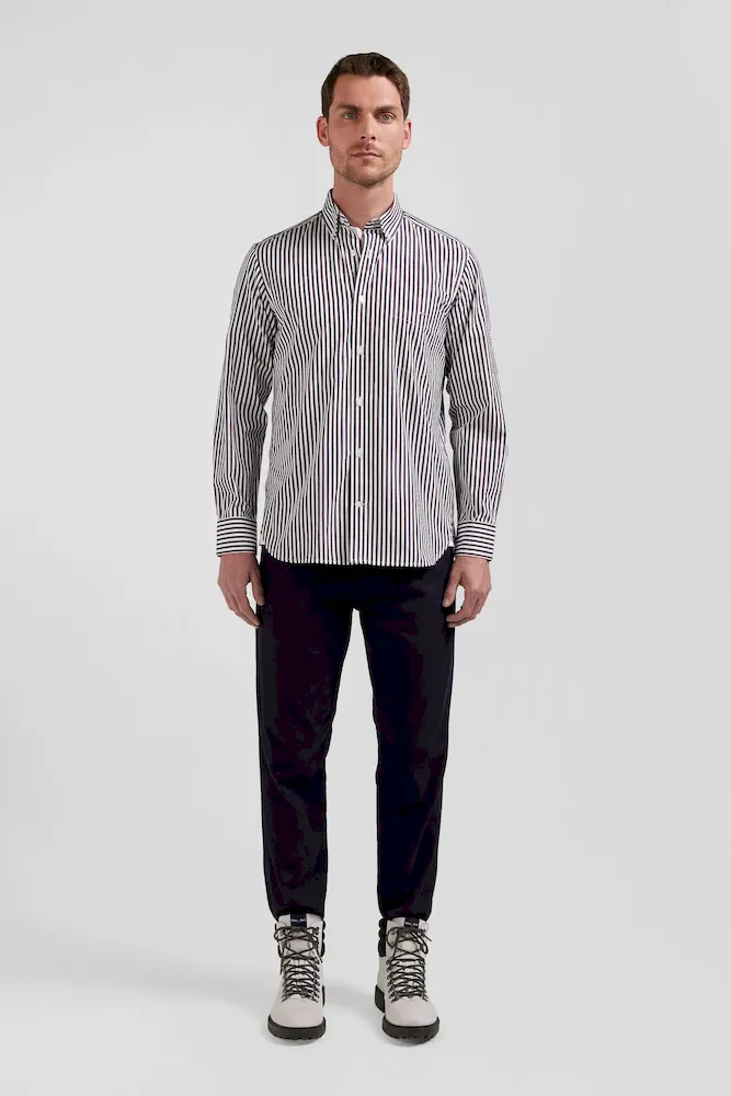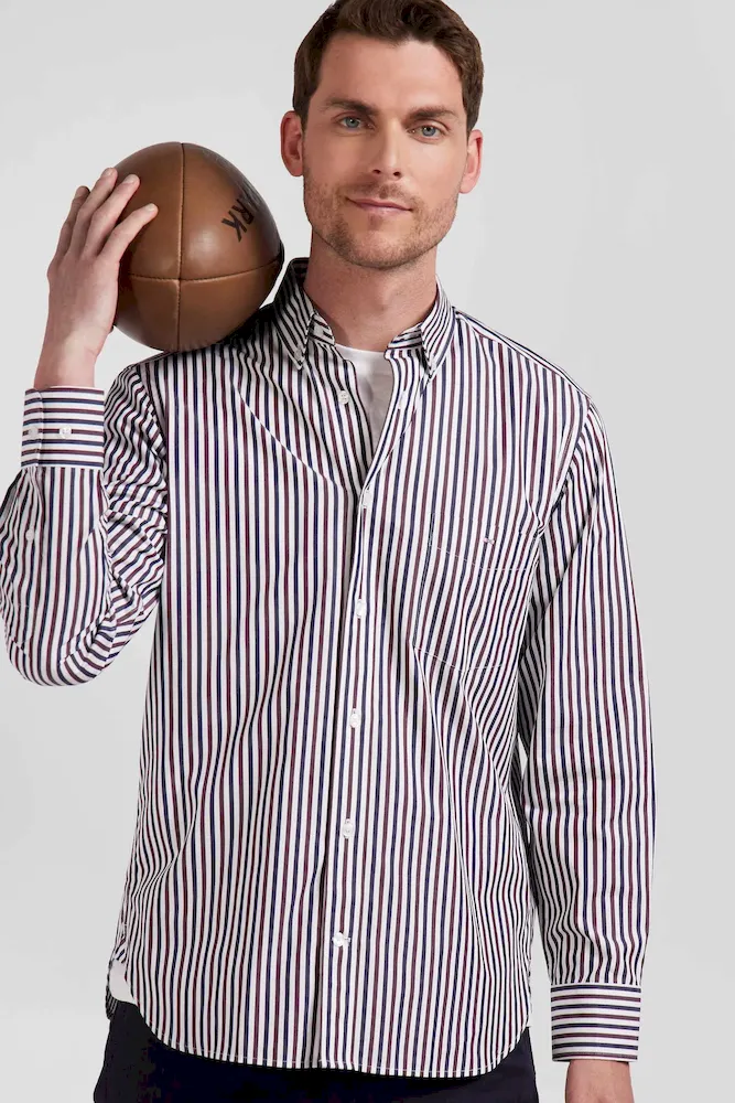 Notre chemise en popeline de coton rayée est conçue pour s’adapter à toutes les silhouettes grâce à sa coupe Regular droite. Ses rayures bâtons bicolores ajouteront une touche de dynamisme à votre tenue. Le col à pointes boutonnées assure un maintien impeccable, tandis que son pli au dos vous permet de bénéficier d’une aisance supplémentaire. Sa broderie nœud papillon sur la poche poitrine signe cette chemise homme d’une touche d’élégance subtile. Ce classique revisité avec modernité est décliné pour la saison dans une large palette de couleurs et s’associe aussi bien à nos pantalons coupe chino qu’à un jean droit.