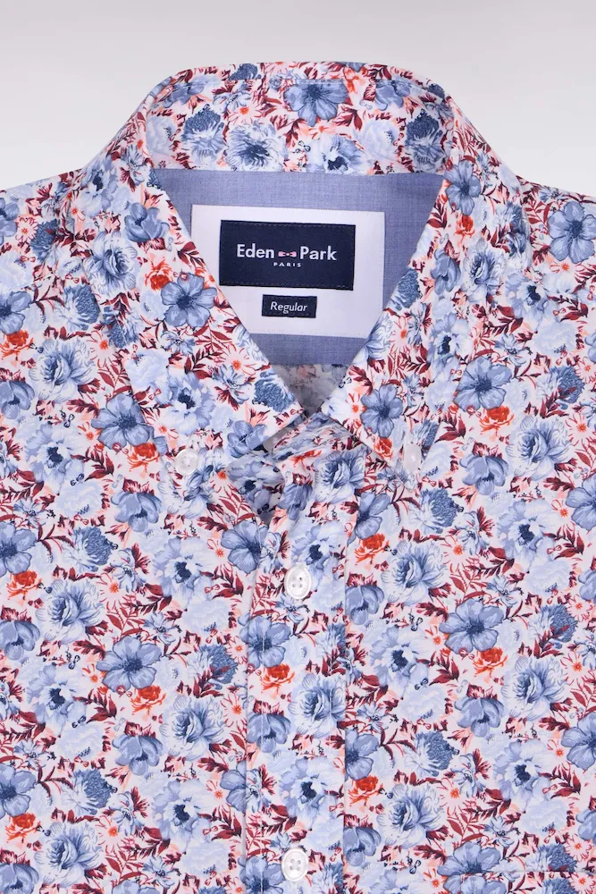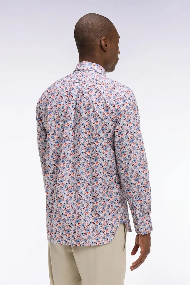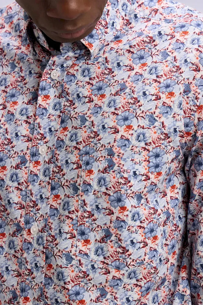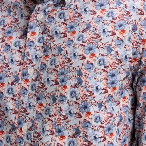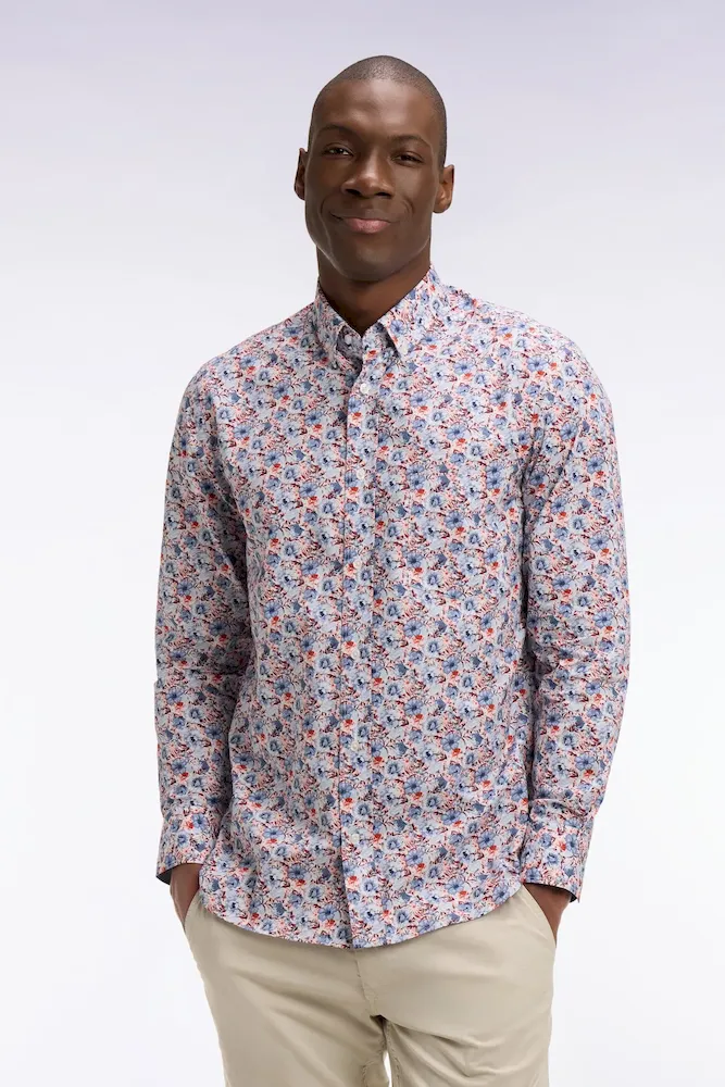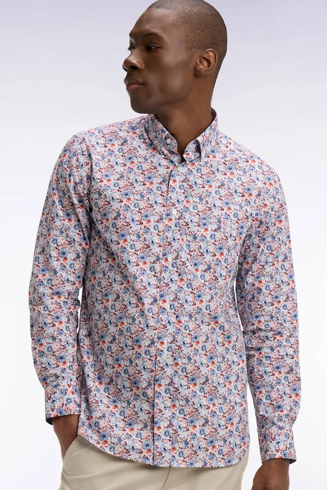 Cette chemise en popeline de coton associe un imprimé floral subtil à des détails chambray pour une allure moderne et raffinée. Sa coupe droite garantit un porté confortable, tandis que son col à pointes boutonnées lui apporte une note structurée, mettant parfaitement en valeur le port de tête. La poche poitrine soulignée de notre emblème brodé ajoute une touche identitaire chère à notre Maison. La légèreté de la popeline, alliée aux finitions soignées, en fait une pièce facile à porter du bureau aux moments plus décontractés.