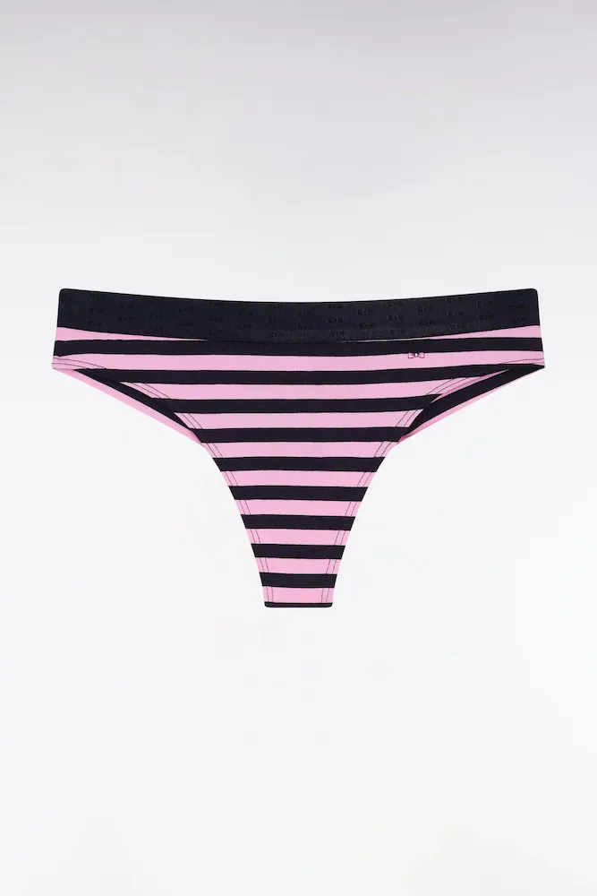 Notre culotte tanga en jersey de modal stretch est le sous-vêtement idéal pour allier discrétion et confort sous des vêtements ajustés. La bande élastique noire discrètement ornée de nœuds papillon ton sur ton apporte une signature visuelle mais aussi un ajustement parfait, faisant de ce tanga à rayure roses et marine un incontournable du vestiaire quotidien