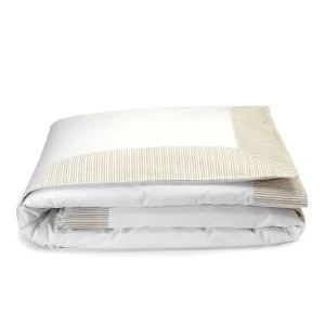 Ornée de plis religieux beige et arborant une broderie nœud papillon blanche, cette housse de couette élégante et raffinée, déclinée dans une percale de coton 200 fils/cm2, vous offrira fraîcheur, douceur et légèreté pour une nuit de sommeil comme à l’hôtel et ce, en toute saison.