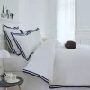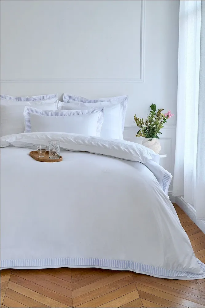 Housse de couette en percale de coton blanche bordures ciel rayées