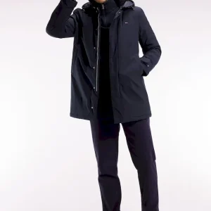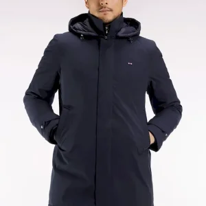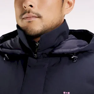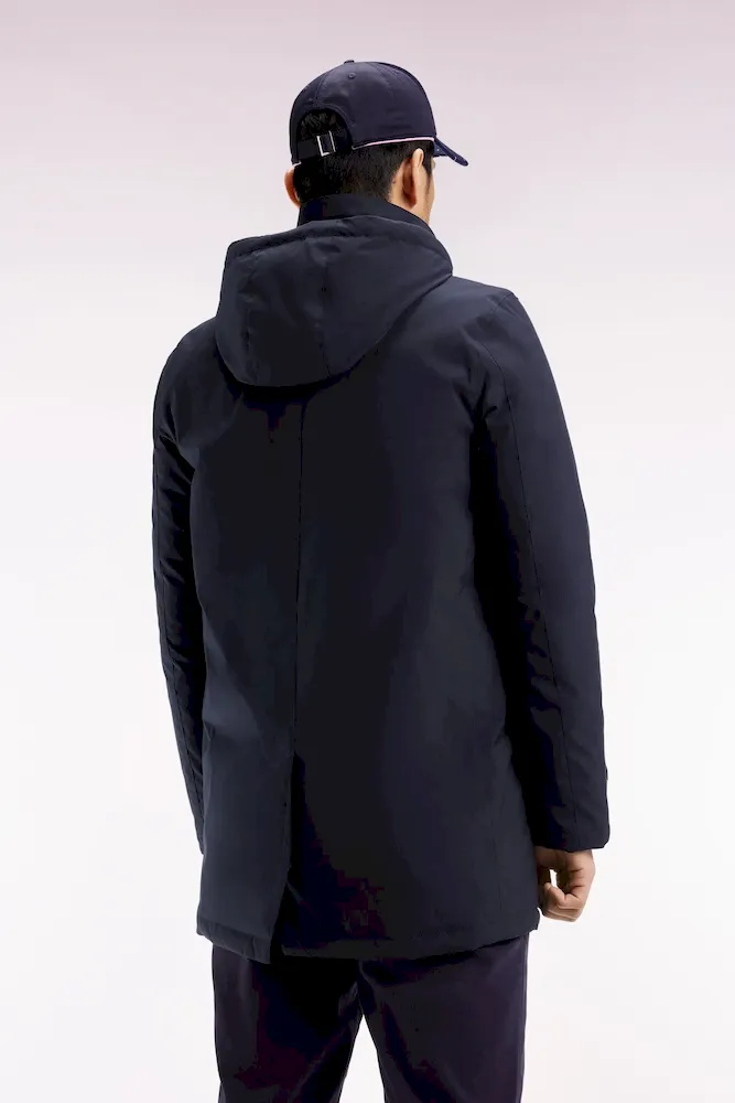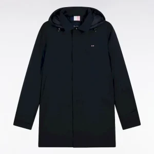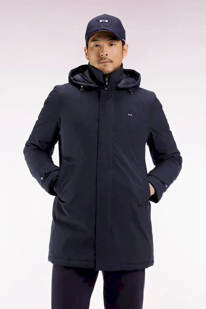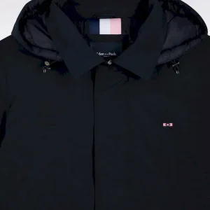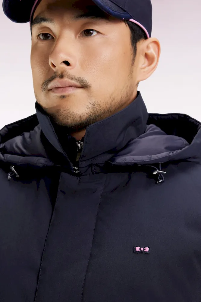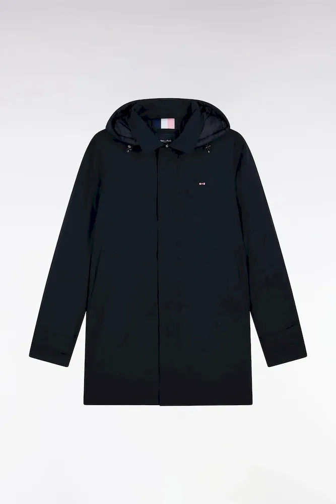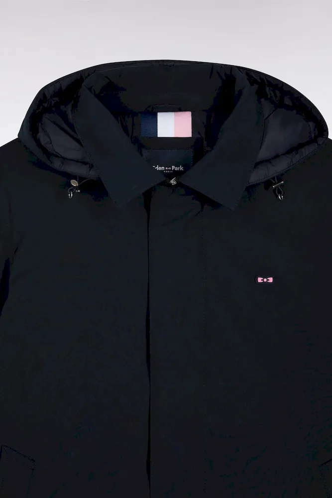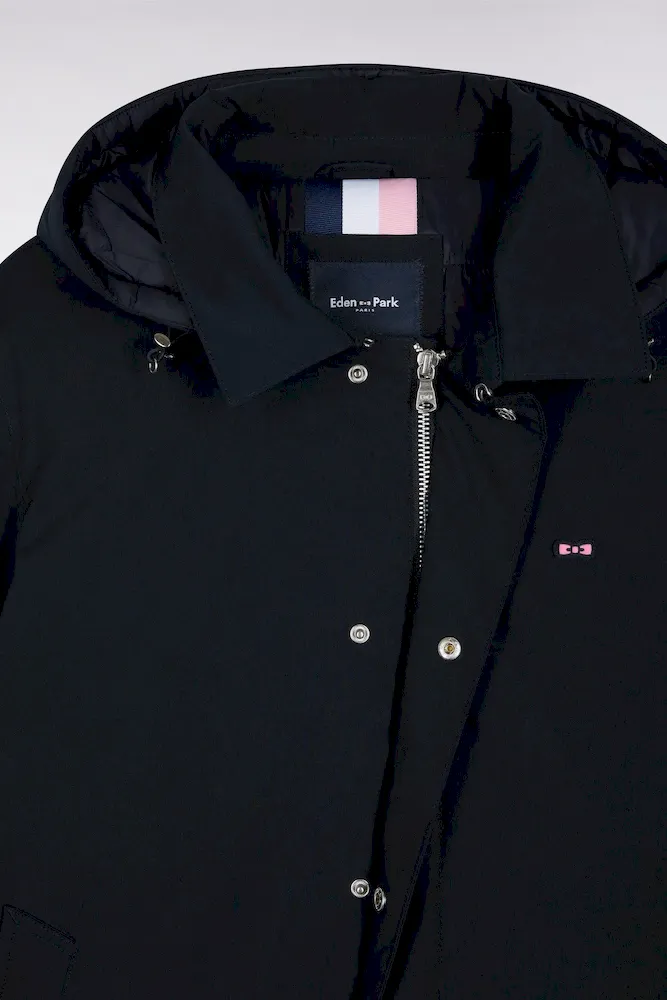 Pensé pour les journées à la météo incertaine, cet imperméable incarne l’élégance sportive propre à Eden Park. Confectionné en nylon déperlant, il assume une silhouette épurée, twistée par une capuche amovible et des finitions impeccables. La doublure matelassée réchauffe le porté, tandis que les détails signature, pressions en métal argenté, ruban tricolore à l’encolure, nœud papillon en gomme, affirment une allure contemporaine et urbaine