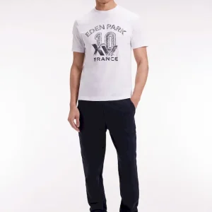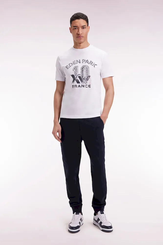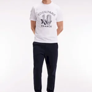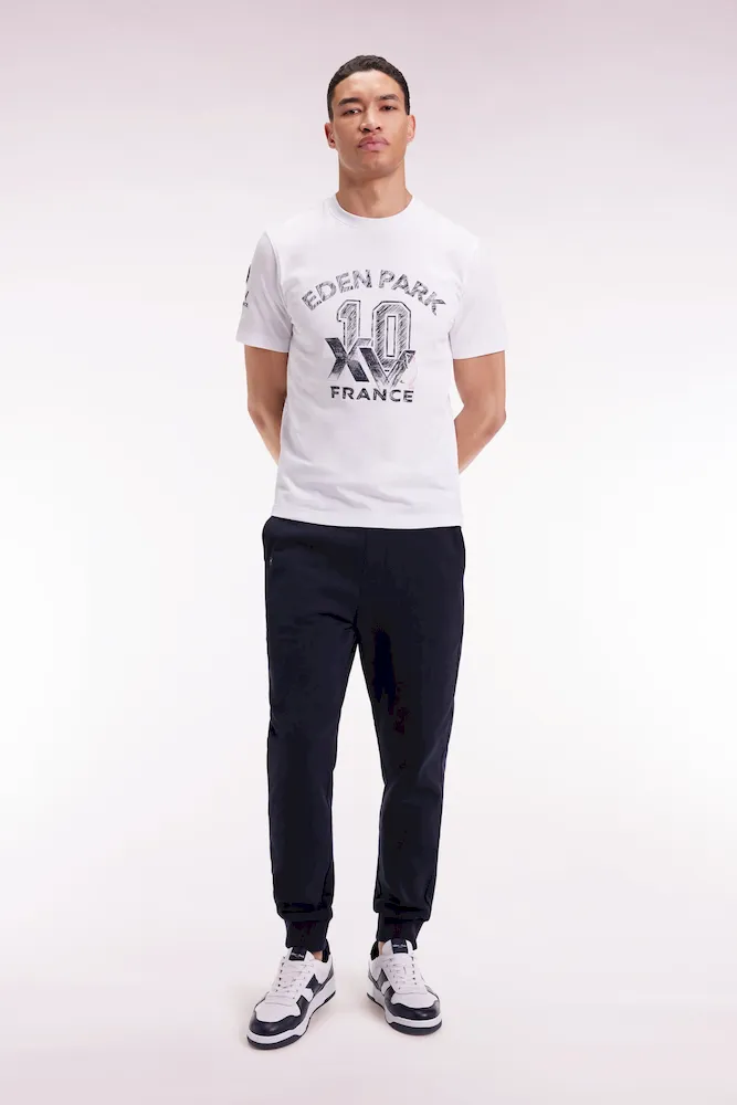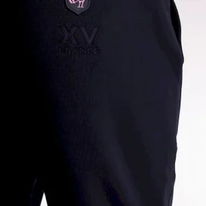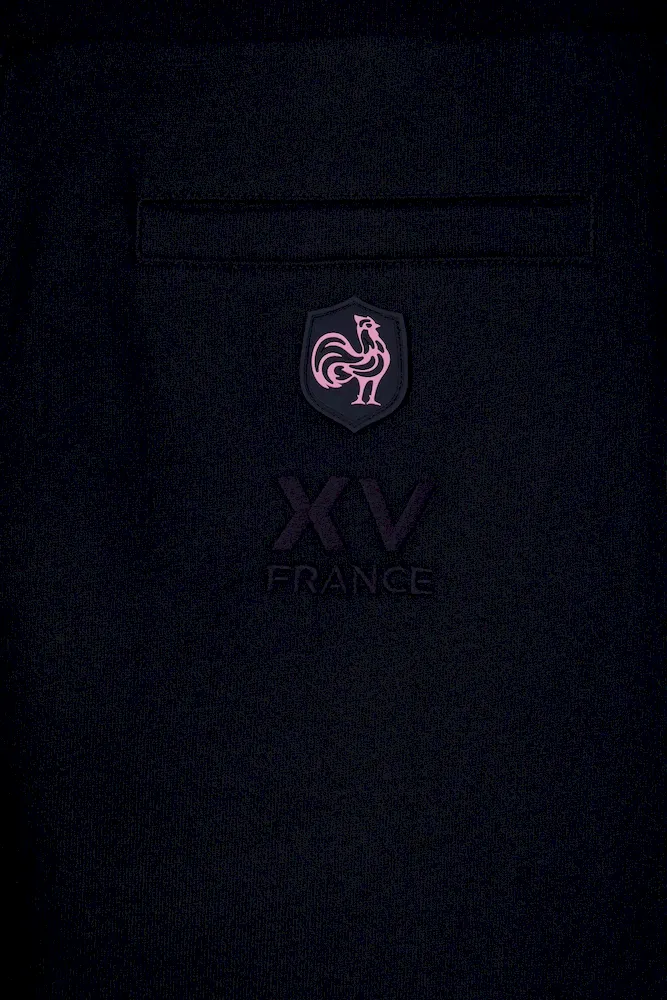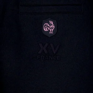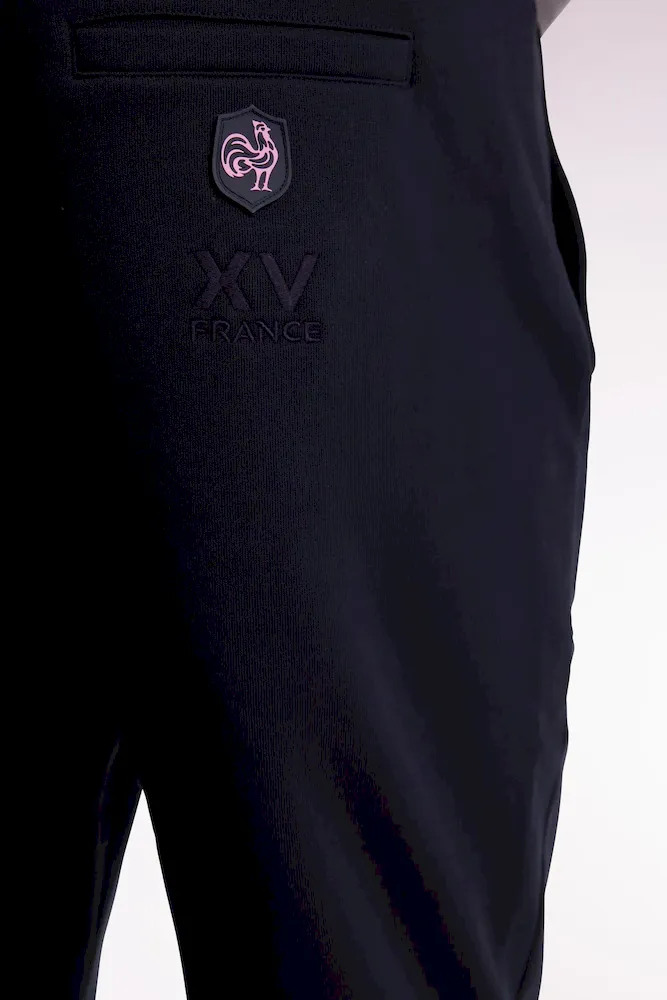 Ce jogging uni en molleton marine se distingue par son cordon de serrage rose et son écusson en gomme brodé du coq FFR. La broderie XV de France ton sur ton signe discrètement cette pièce confortable qui ravira les amateurs de style comme de rugby