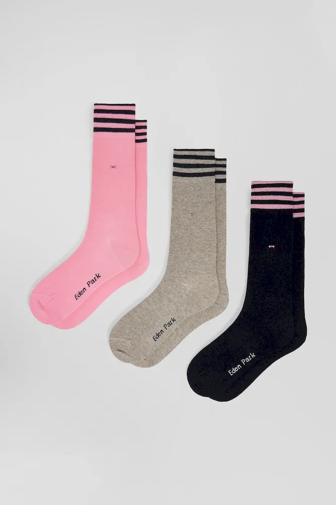 Nos chaussettes montantes cerclées de rayures horizontales sont des incontournables. Ce lot de trois paires de chaussettes de couleurs différentes proposées en colorama marine, gris ou marron s’accorde parfaitement au vestiaire de la saison printemps-été comme à vos intemporels favoris.