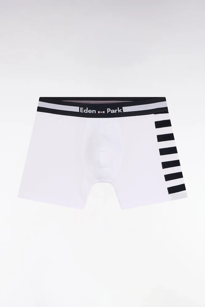 Entre sobriété et esprit graphique, ce lot de sous-vêtements pour homme réunit deux boxers en coton stretch : l’un uni, l’autre animé de rayures sur le côté. Maintien optimal et taille élastiquée siglée complètent ces basiques sport-chic