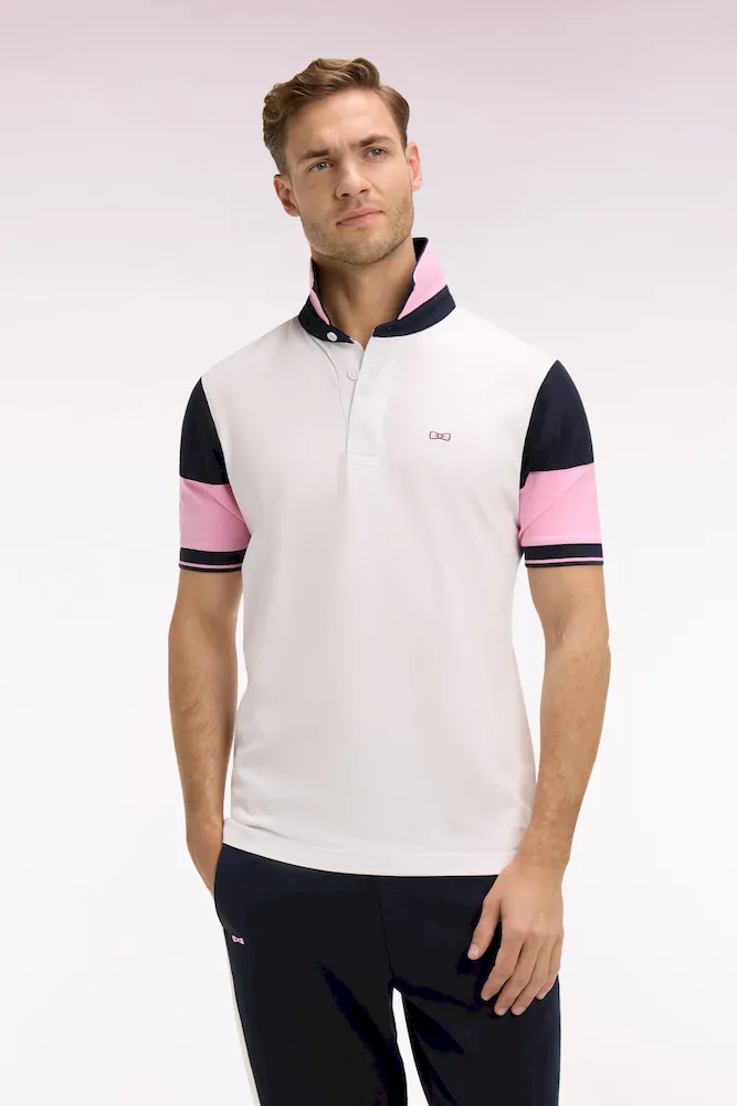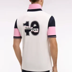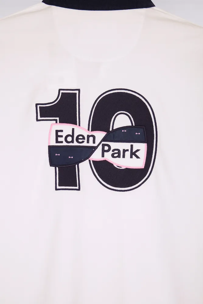 Indissociable de nos collections, le maillot inspiré des codes du rugby est proposé pour la saison dans un jersey de coton doux marine et blanc aux accents roses. Allié d’un style masculin subtilement décontracté, il se distingue par son col maillot à dessous de col rose, un détail perceptible porté le col relevé et par ses manches bicolores s’achevant sur une bordure tricotés subtilement rayée. Au dos, ce maillot arbore la broderie 10 typique de nos collections, rehaussée d’un tissu cravate exclusif à Eden Park. Un essentiel du vestiaire sport chic masculin.