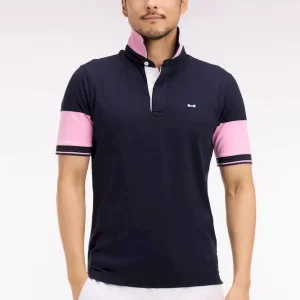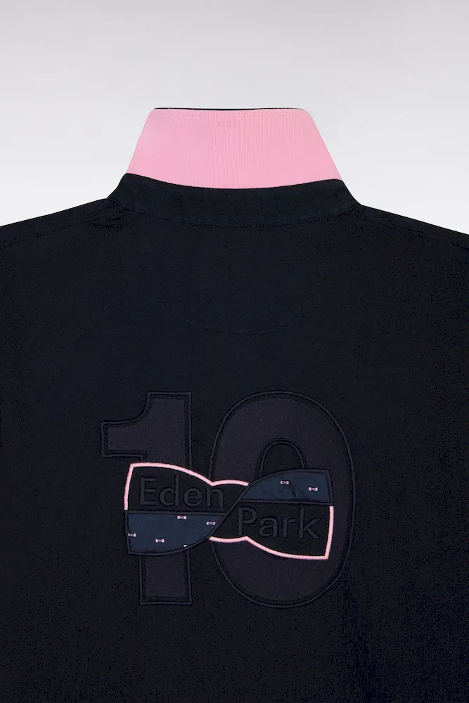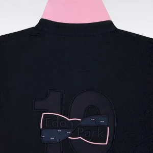 Indissociable de nos collections de mode, le maillot inspiré des codes du rugby est proposé pour la saison dans un jersey de coton doux marine et blanc aux accents roses. Allié d’un style masculin subtilement décontracté, il se distingue par son col maillot à dessous de col rose, un détail perceptible porté le col relevé et par ses manches bicolores s’achevant sur une bordure tricotés subtilement rayée. Au dos, ce maillot arbore la broderie 10 typique de nos collections, rehaussée d’un tissu cravate exclusif à Eden Park.
