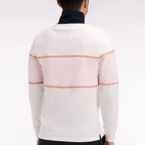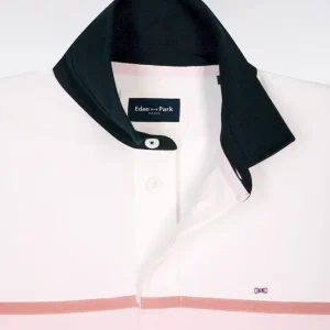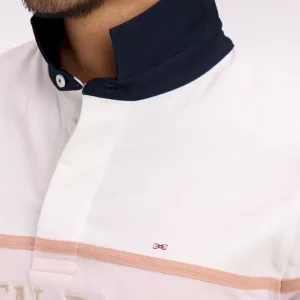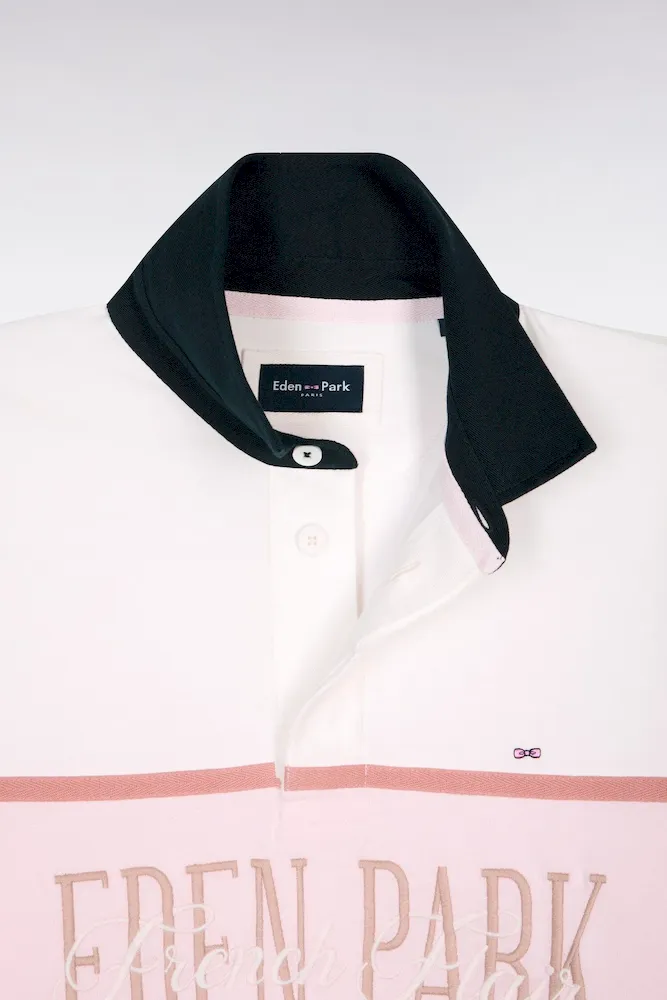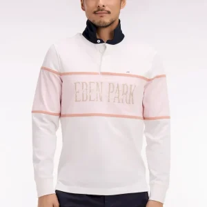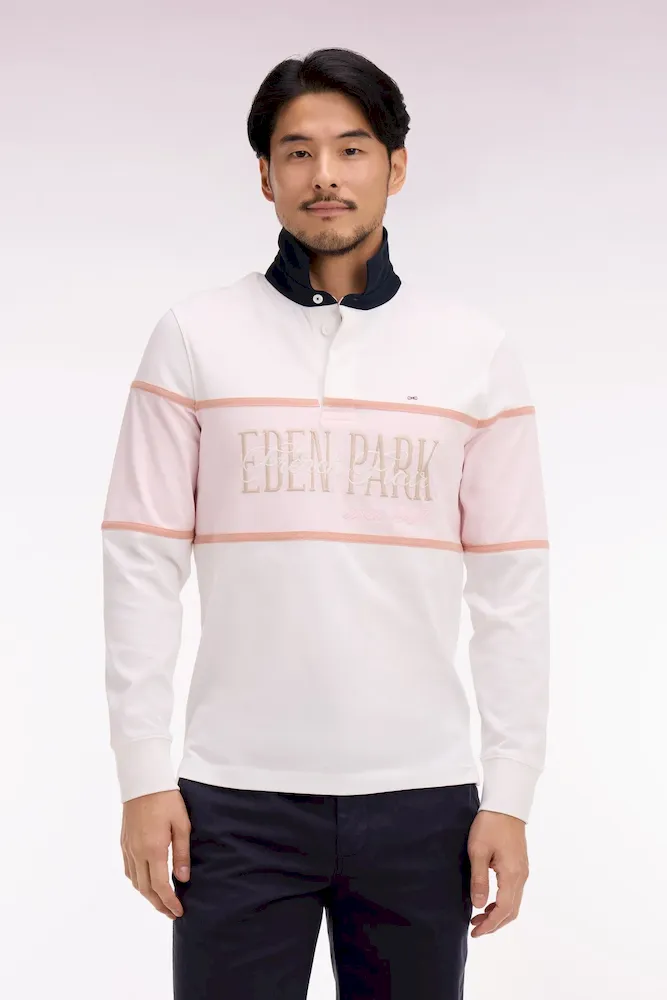 Ce maillot à manches longues en coton écru ou ciel s’impose par son allure sport chic inspirée de l’esprit Ivy League. Sa large bande contrasté, rose ou écru selon le modèle choisi, et son col marine apportent un contraste élégant et graphique, tandis qu’une broderie sérigraphiée Eden Park French Flair au style vintage souligne son caractère affirmé. Confectionné avec soin dans une étoffe douce, respirante et résistante, ce modèle revisite le maillot de rugby classique avec une touche mode et contemporaine.