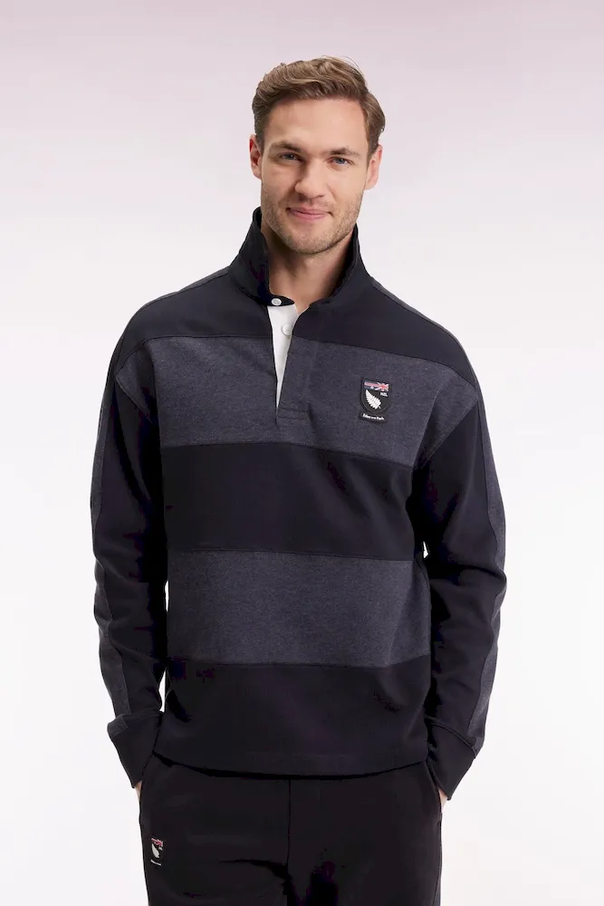 En noir et gris ou gris et beige, ce maillot à manches longues en jersey épais à la coupe ample revisite l’esprit des tenues de rugby avec ses rayures coupées-cousues et son design affirmé. Le dos est orné d’une broderie New Zealand signature, tandis que les finitions contrastées en twill et bords-côtes renforcent son style sport chic hommage à la Nouvelle Zélande, terre de prédilection du rugby. Un modèle à porter avec un jean ou avec son jogging coordonné