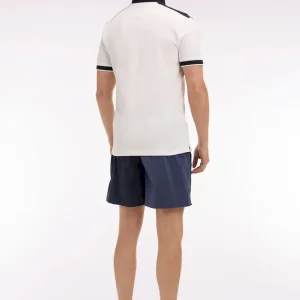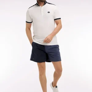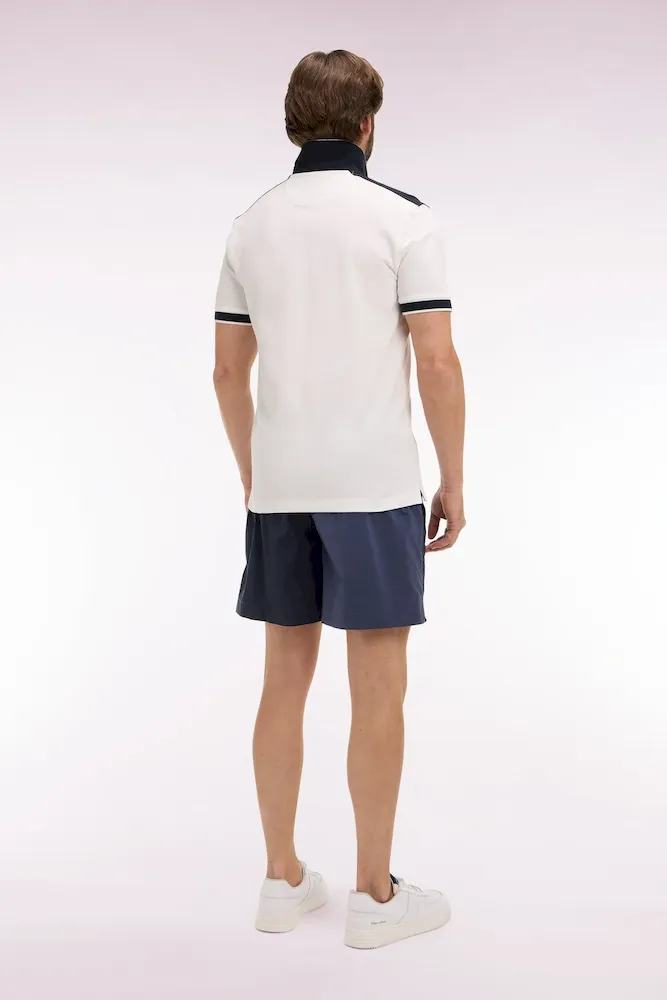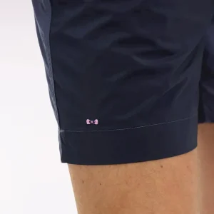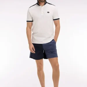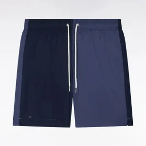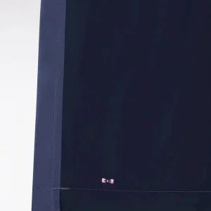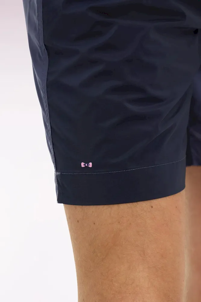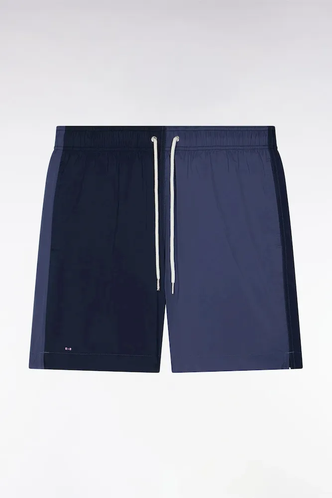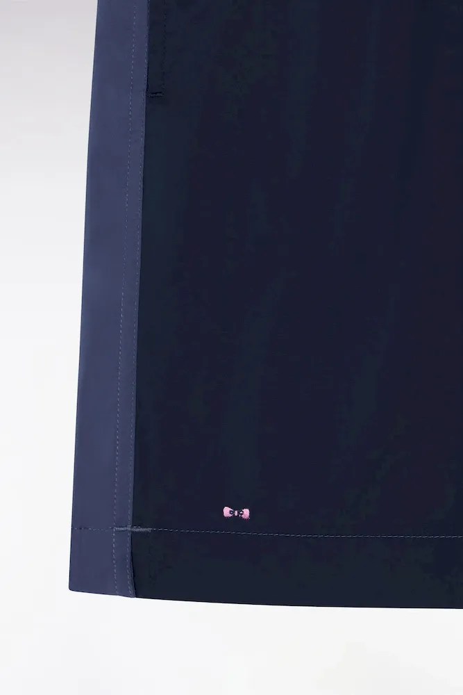 Ce maillot de bain bicolore réalisé présente une jambe marine et l’autre légèrement contrastée dans les mêmes tonalités, une touche graphique inspirée à notre Maison par les maillots de rugby japonais. Il dispose d’une poche arrière passepoilée avec fermeture velcro, d’un filet ultra fin et arbore notre inimitable broderie nœud papillon rose sur la jambe.