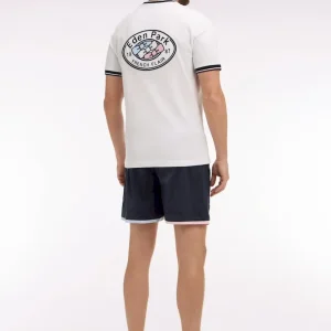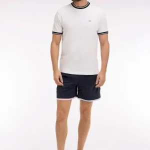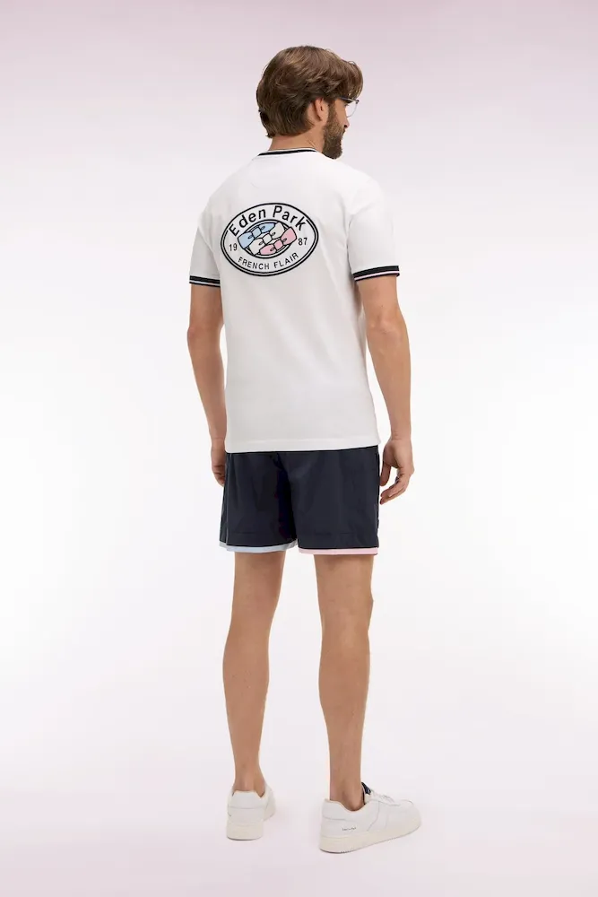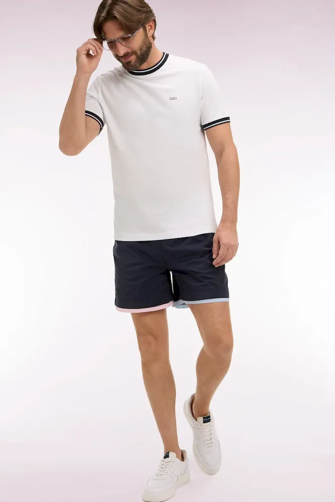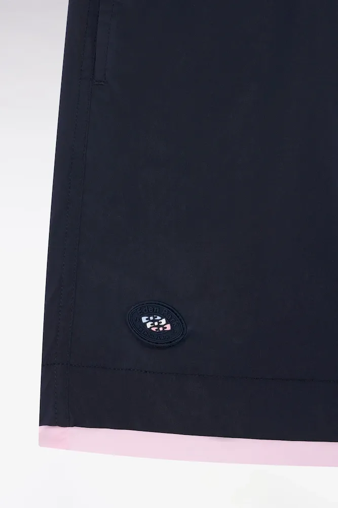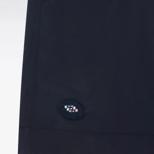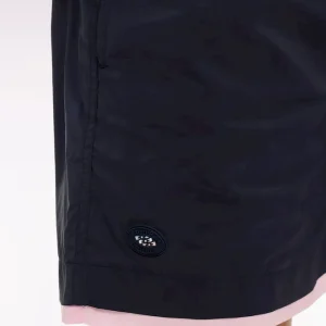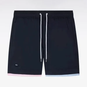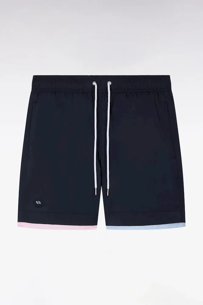 Ce maillot de bain marine présente des bordures de jambe rose ou ciel pour une touche graphique façon trompe-l’œil, parfaitement dans les codes de notre vestiaire. Il dispose d’une poche arrière passepoilée avec fermeture velcro, d’une confortable doublure filet et arbore notre inimitable badge nœud papillon tricolore sur la jambe.