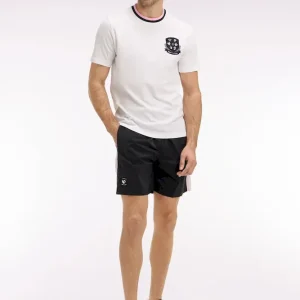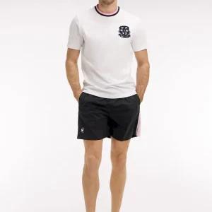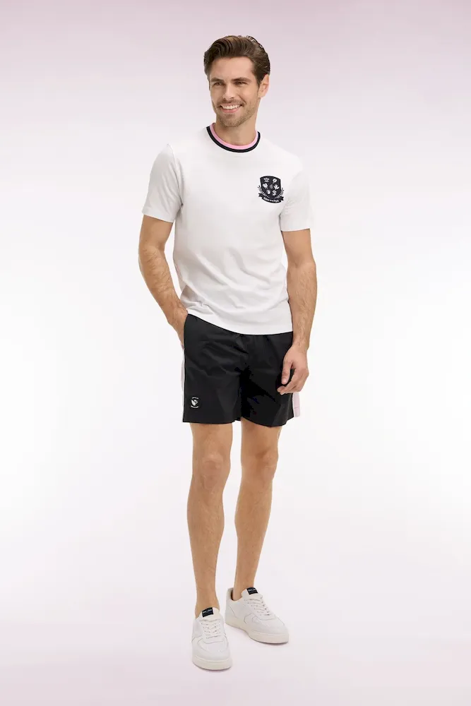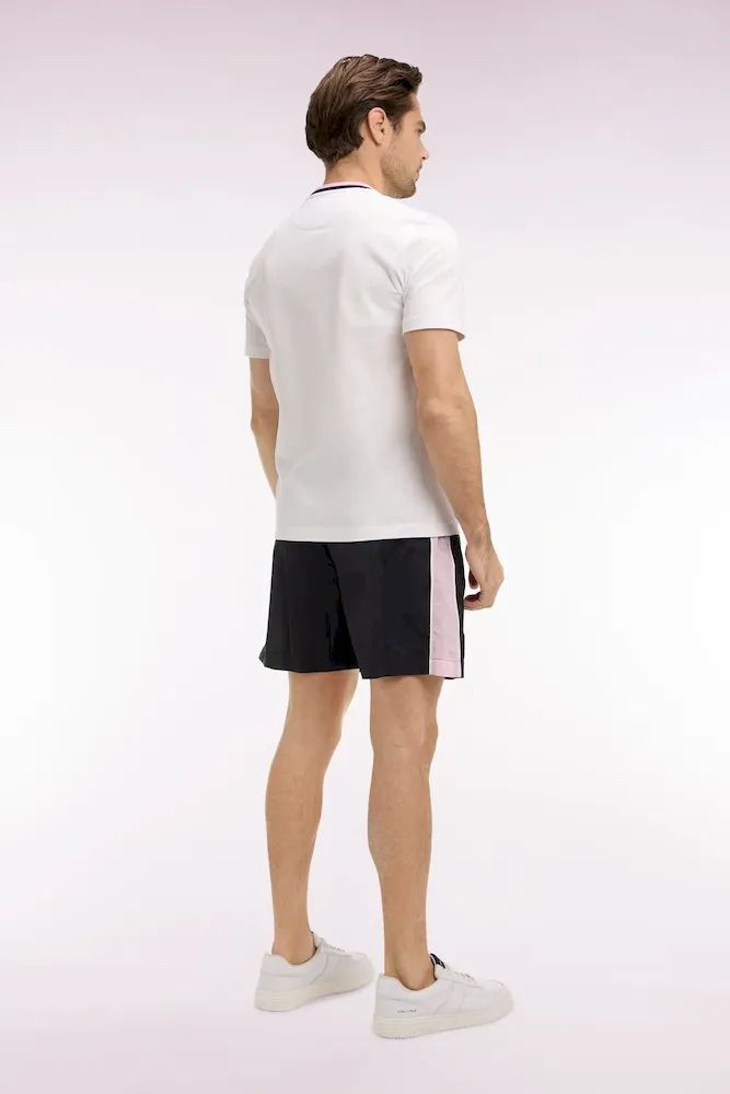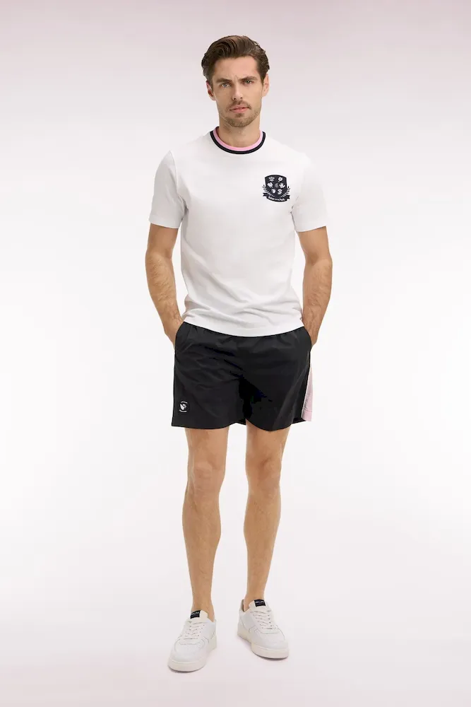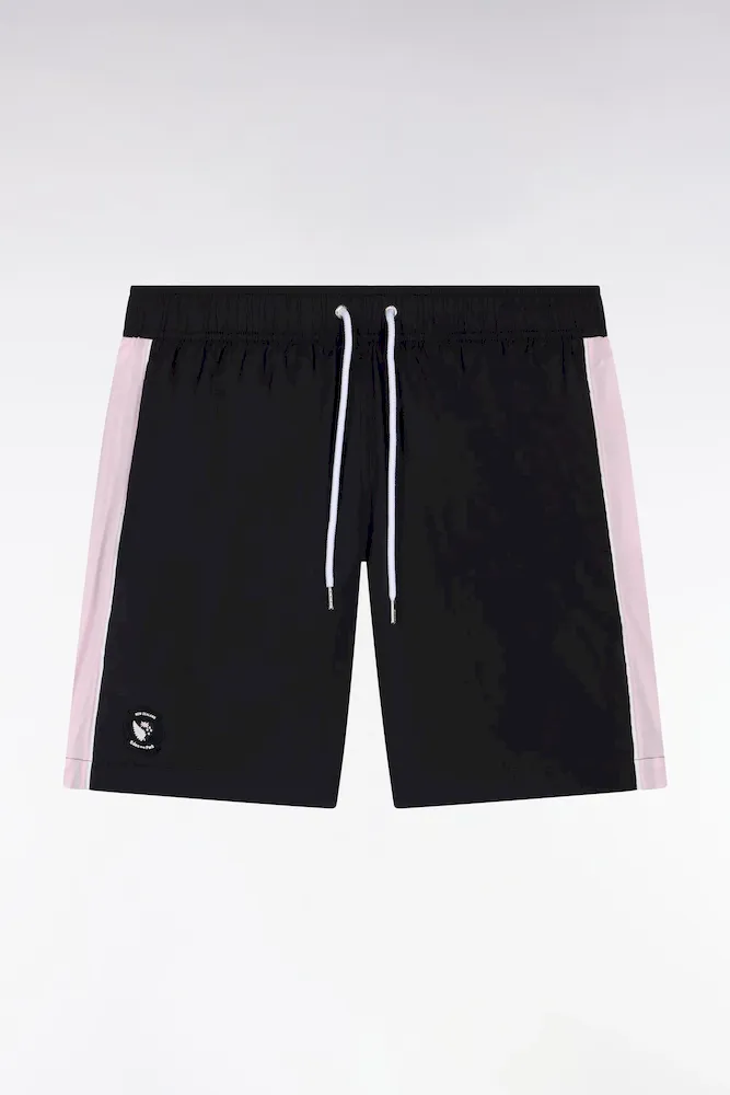 Faisant partie de notre capsule Nouvelle Zélande aux coloris contrastés, ce short de bain pour homme se distingue par son coloris noir profond animé de découpes roses soulignées par un passepoil contrasté le long de la jambe. Sa taille élastiquée, doublée du même coloris rose, assure un style impeccable et une tenue parfaite baignade après baignade. Graphique et minimaliste, ce maillot de bain comporte une poche arrière passepoilée et un badge New Zealand en gomme silicone en bas de la jambe, pour une signature subtile.