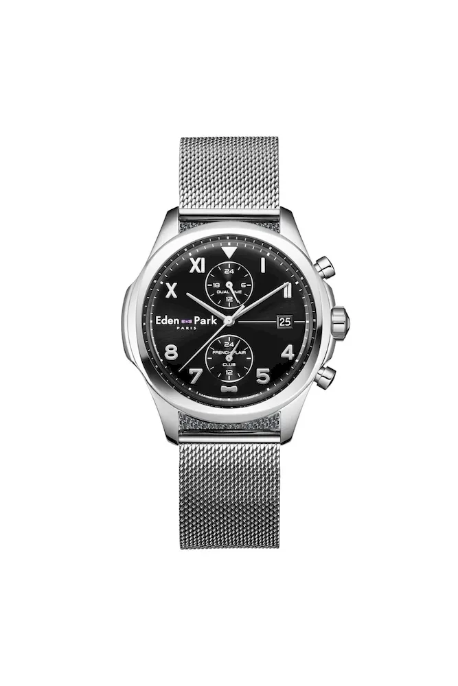 Destinée aux amateurs de voyages et d’élégance, cette montre Eden Park de la collection French Flair Club séduit par son cadran noir profond, rehaussé d’index argentés. Son bracelet en maille milanaise renforce son style intemporel et sophistiqué. Dotée d’une fonction dual time, elle permet de suivre deux fuseaux horaires en toute simplicité, idéale pour les globe-trotters élégants. Avec son boîtier en acier inoxydable et son mouvement quartz précis, cette montre est le compagnon idéal pour conjuguer style et praticité au quotidien.