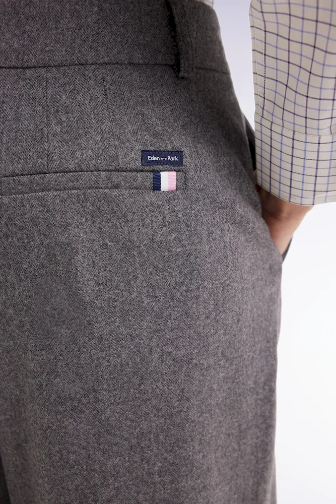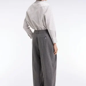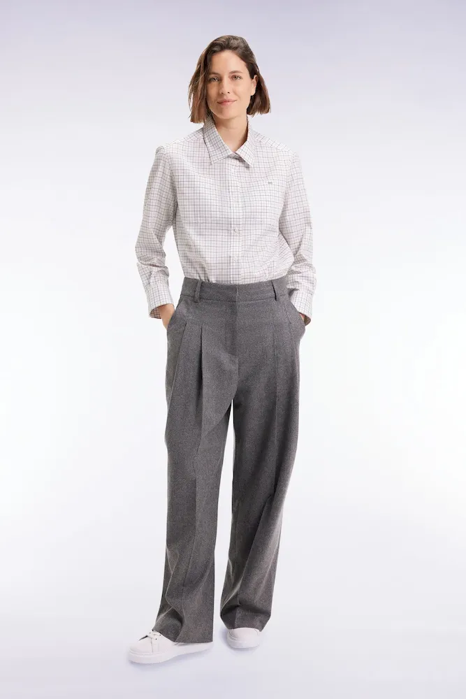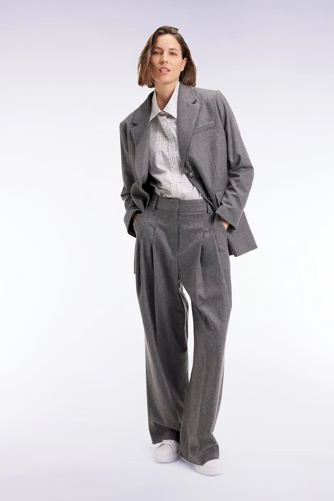Confectionné dans une étoffe chevron comportant de la laine vierge pour plus de douceur et un porté chaud en hiver, ce pantalon en flanelle grise est une valeur sûre de l’élégance féminine. Sa coupe oversized et sa jambe large marquée de deux plis avant apportent une touche boyish à ce pantalon à la taille montée revisitant le savoir-faire sartorial de la mode française. Portez ce modèle avec une chemise cintrée ou en total look avec la veste blazer coordonnée pour une silhouette urbaine tendance