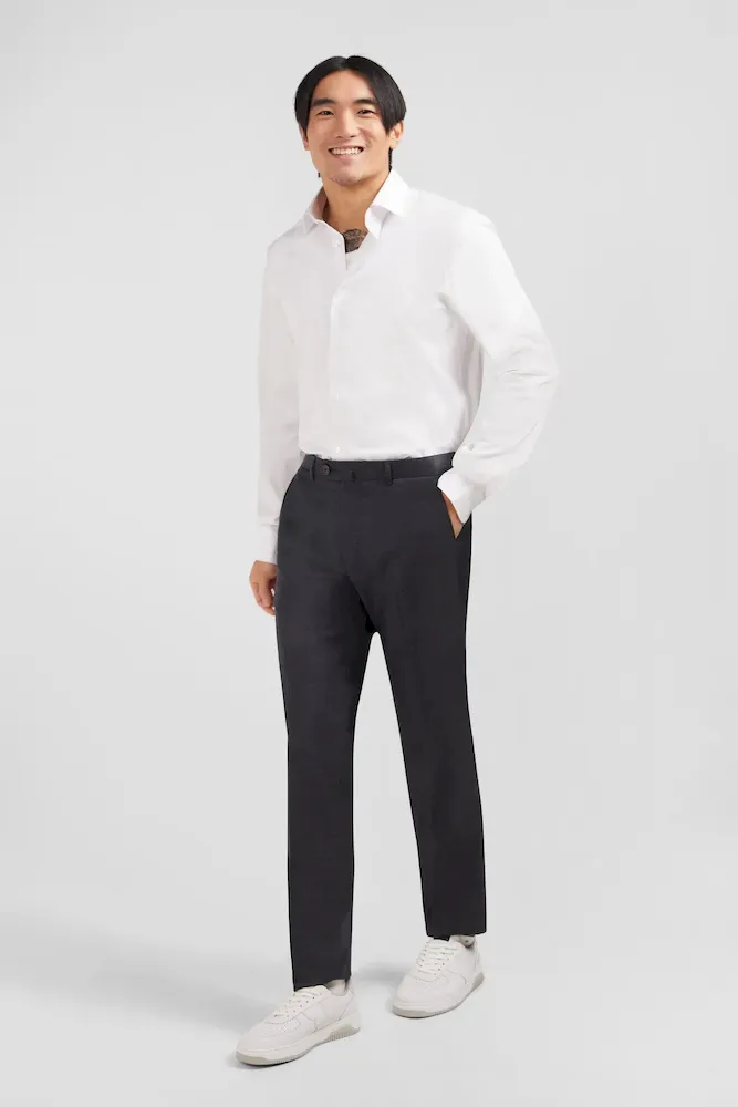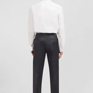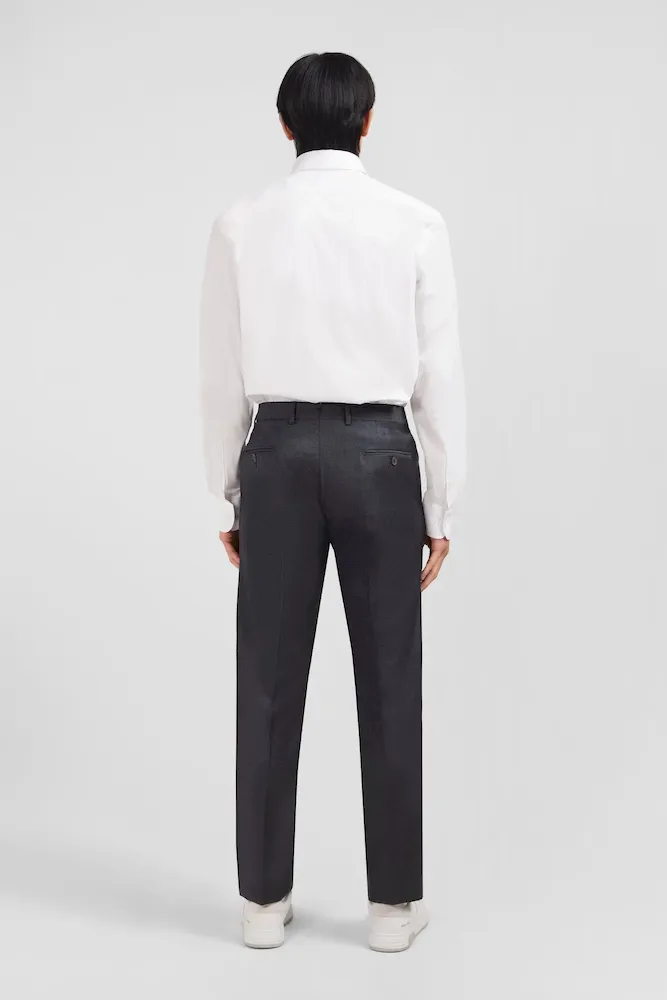 Conçu en laine fine, ce pantalon est élégant à souhait avec sa coupe droite et ses jambes à plis cassés. Il dispose d’une taille ajustable grâce à sa patte boutonnée et des passants pour ceinture. Fonctionel, le pantalon possède des poches italiennes, une poche ticket prise dans la couture sous la taille, ainsi que deux poches passepoilées et boutonnées au dos.