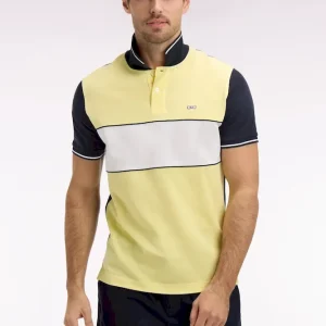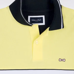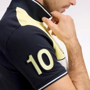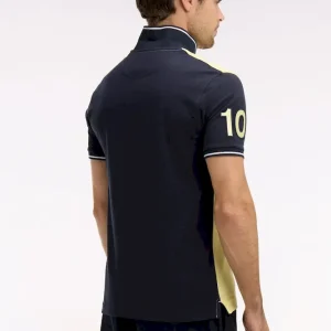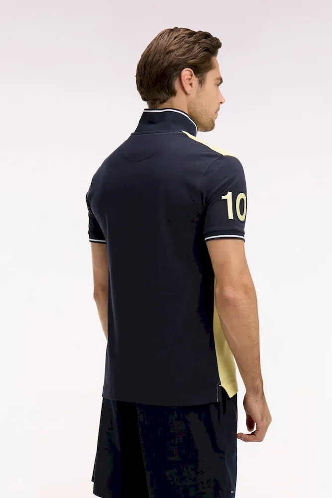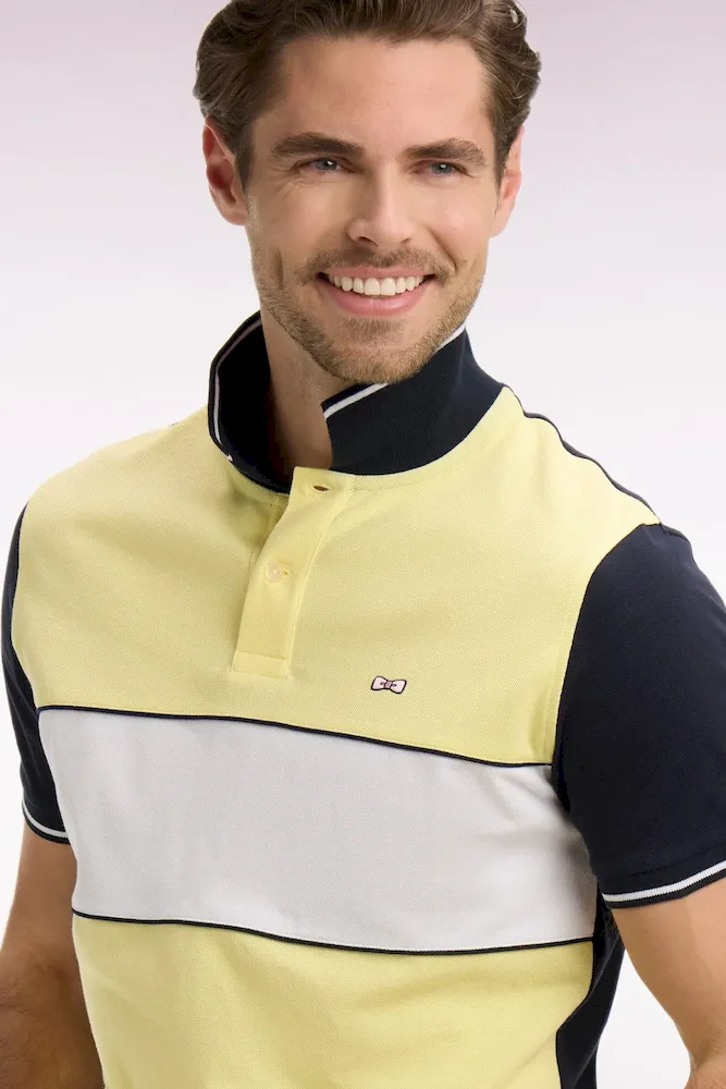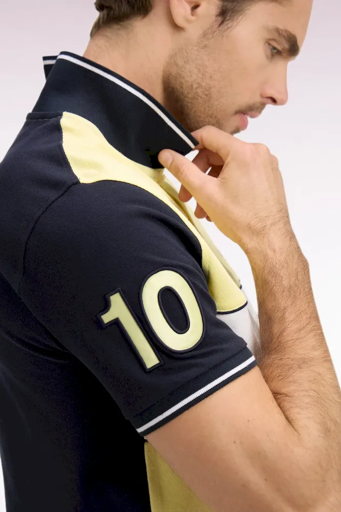 Ce polo masculin en piqué de coton coupe regular célèbre l’ADN rugby de la Maison grâce à sa large bande poitrine blanche, soulignée de passepoils marine qui structurent la silhouette. Le nœud papillon brodé et la broderie 10, enrichie d’une application en tissu cravate, renforcent son caractère identitaire. Son col et ses bas de manches en bords-côtes tricotés sont rehaussés d’un liseré contrasté, pour une touche élégante et sportive. Décliné dans les 4 coloris pastel signature de la saison, toujours associé à l’intemporel marine, ce polo à manches courtes incarne la modernité et la polyvalence du vestiaire sport chic Eden Park.