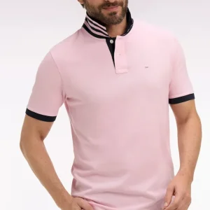 Polo manches courtes en piqué coton rose clair dessous de col rayé coupe slim