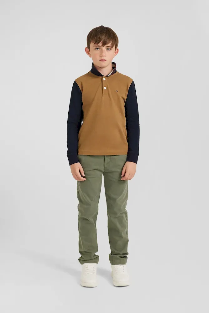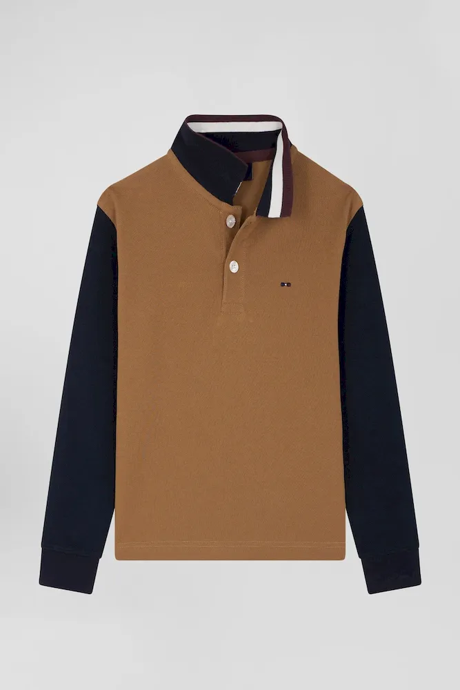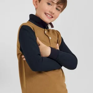 Introduisez une touche de distinction dans le vestiaire de votre enfant avec notre polo à manches longues, élégamment conçu en coloris noisette avec des manches marine pour un contraste saisissant. Le col est orné d’un jacquard tricolore portant l’inscription Eden Park, ajoutant une signature emblématique au design. Sur la poitrine, une broderie de nœud papillon tricolore enrichit ce polo, fusionnant style classique et détails sportifs. Parfait pour les occasions spéciales ou pour rehausser une tenue quotidienne, ce polo est un symbole de raffinement et d’élégance jeune.