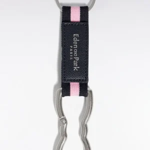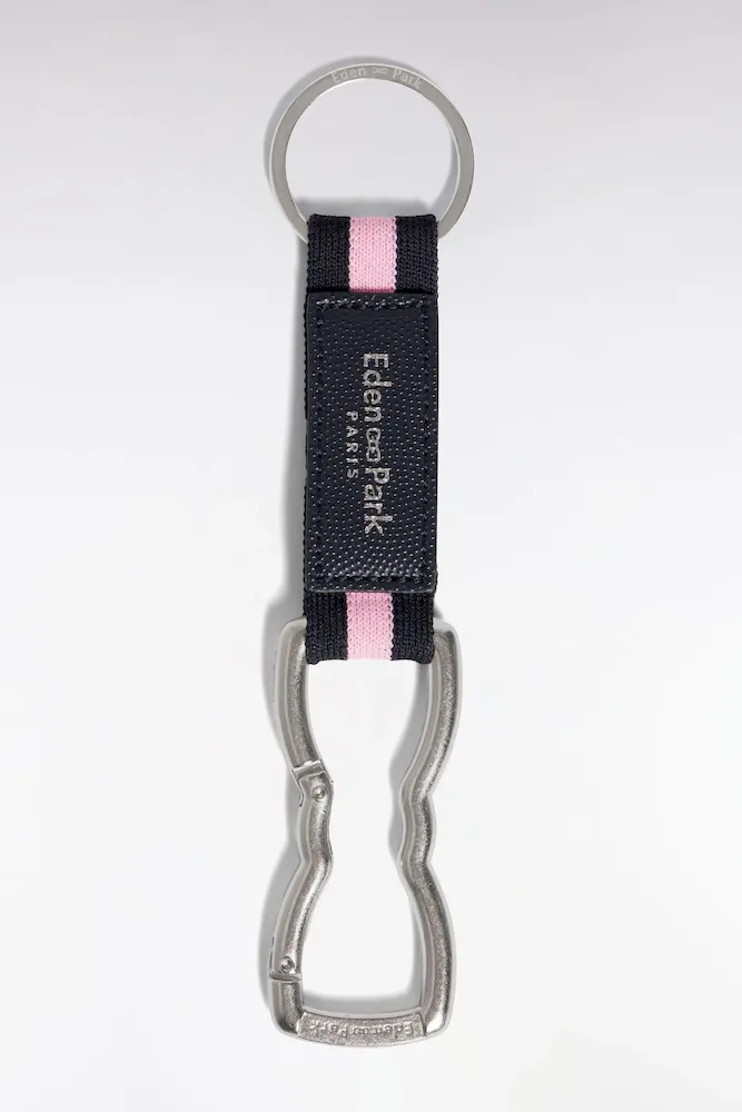 Alliance de robustesse et de style, ce porte-clés mousqueton arbore une sangle en toile noire traversée d’une rayure rose emblématique. Le mousqueton en métal brossé, subtilement gravé Eden Park, rappelle la forme de notre emblème : le nœud papillon. Un accessoire à la fois utilitaire et tendance