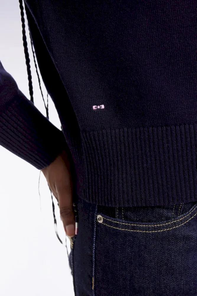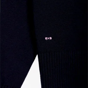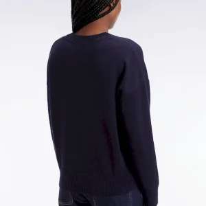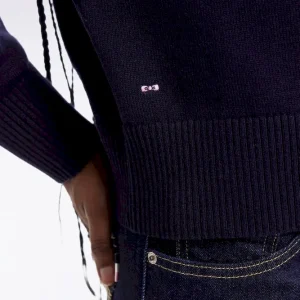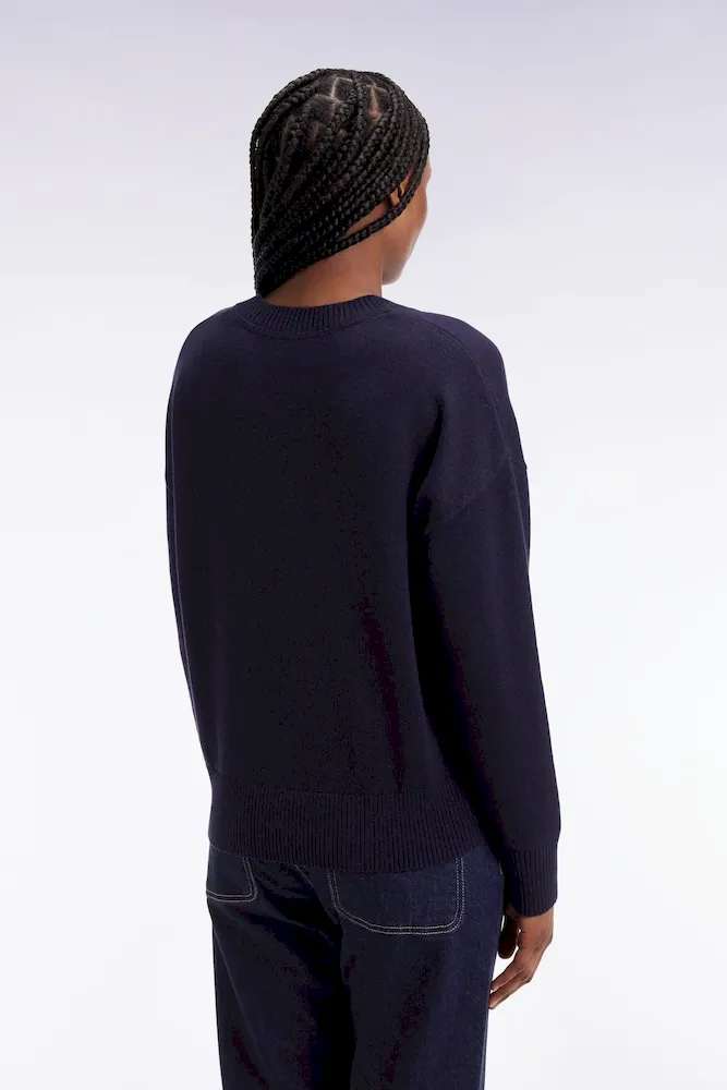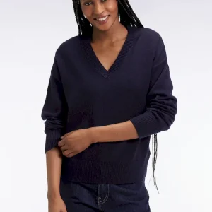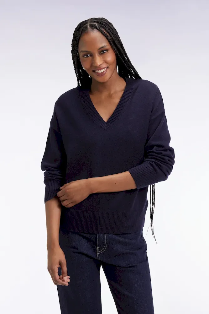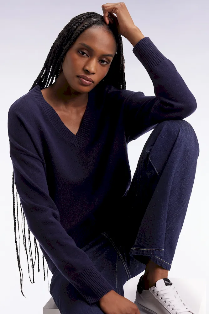 Pull à col V en laine et coton marine coupe Relaxed