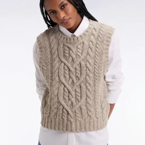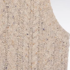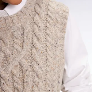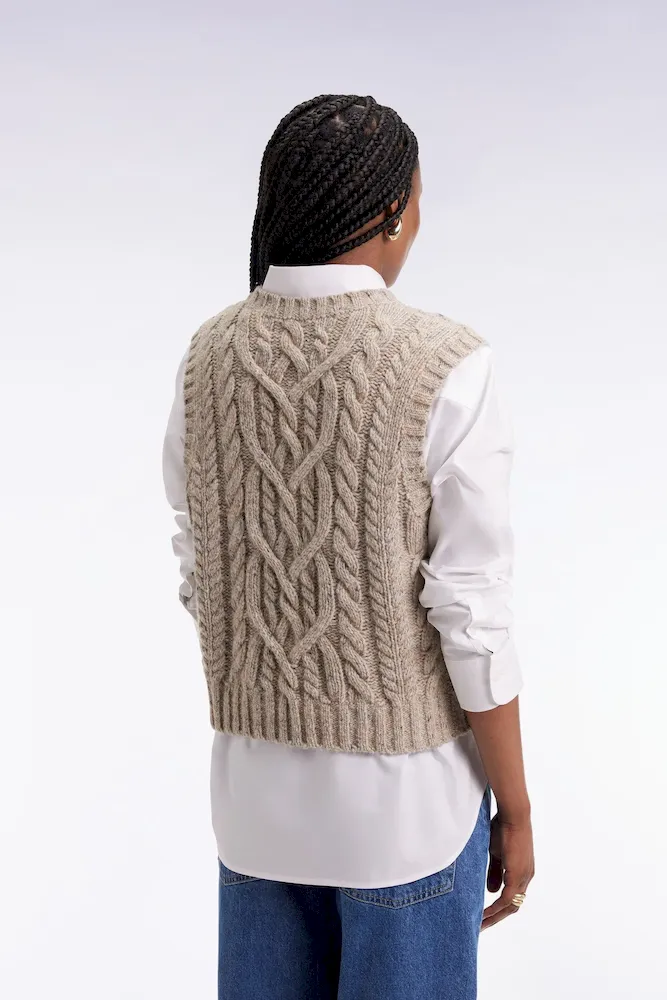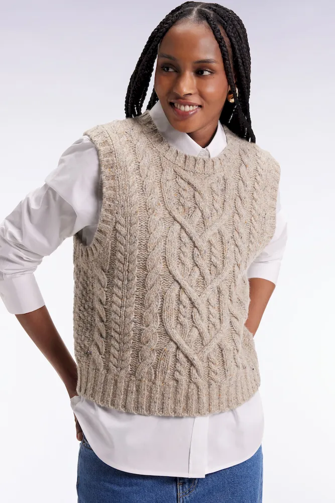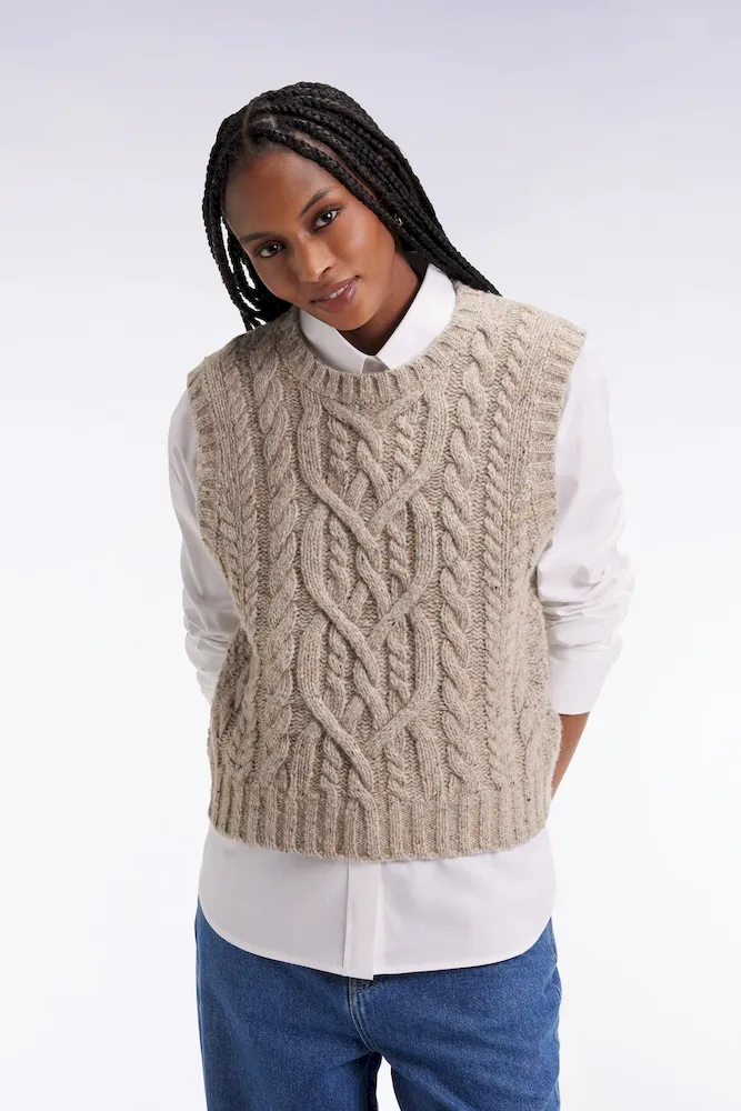 Ce pull sans manches à torsades joue sur les contrastes avec style et audace. Tricoté dans une maille moulinée à effet chiné pour un effet gros pull aux proportions maitrisées, ce pull femme séduit par sa coupe courte et son fini graphique. À superposer sur une chemise oversized pour un style affirmé et structuré s’amusant des volumes
