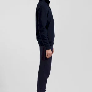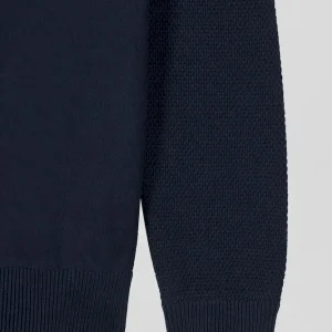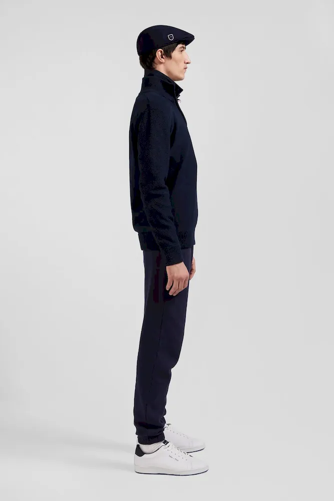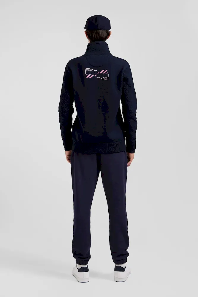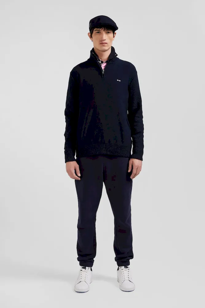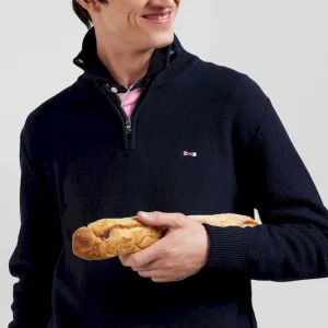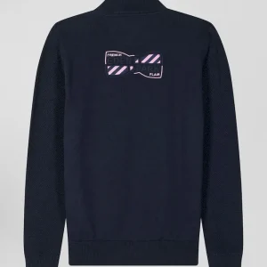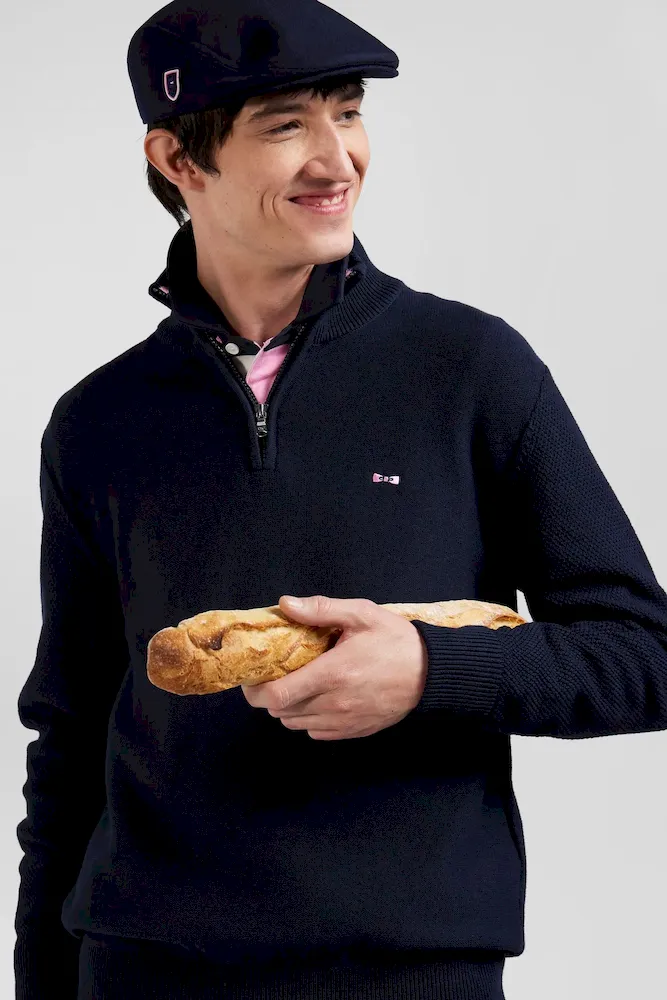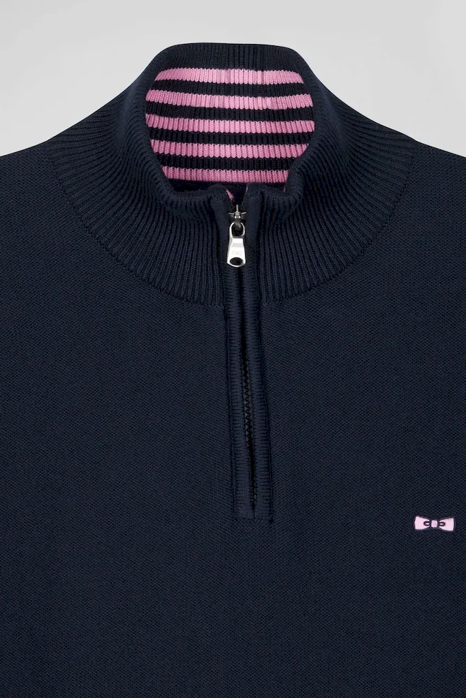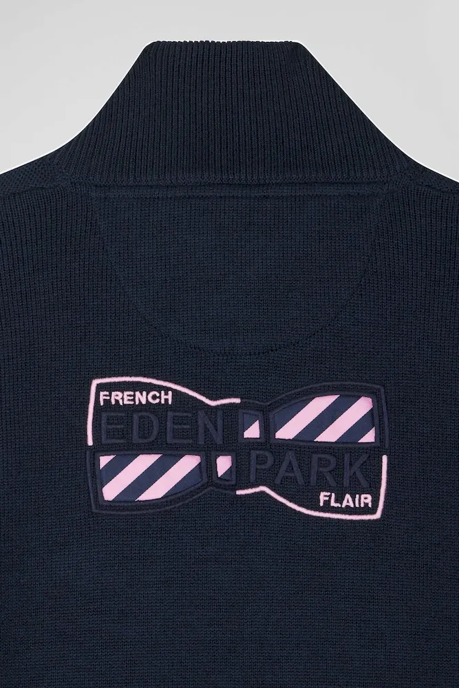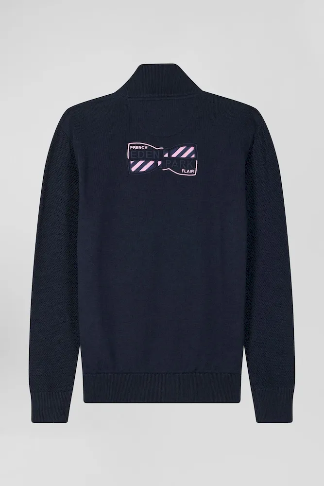 Ce pull marine à col camionneur zippé se distingue par ses jeux de tricotage créant un effet de relief. Sa broderie dos en tissu cravate revisitant notre emblématique nœud papillon incarne l’esprit chic et décalé de notre Maison : le French Flair Eden Park.