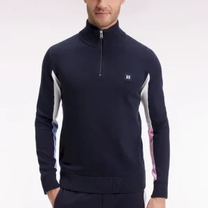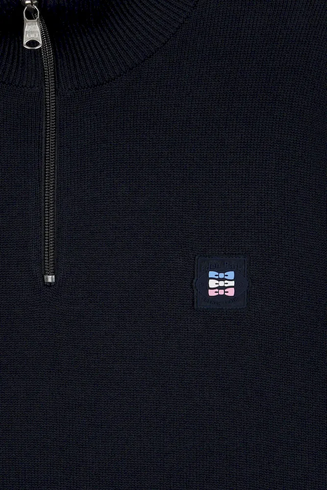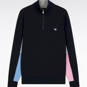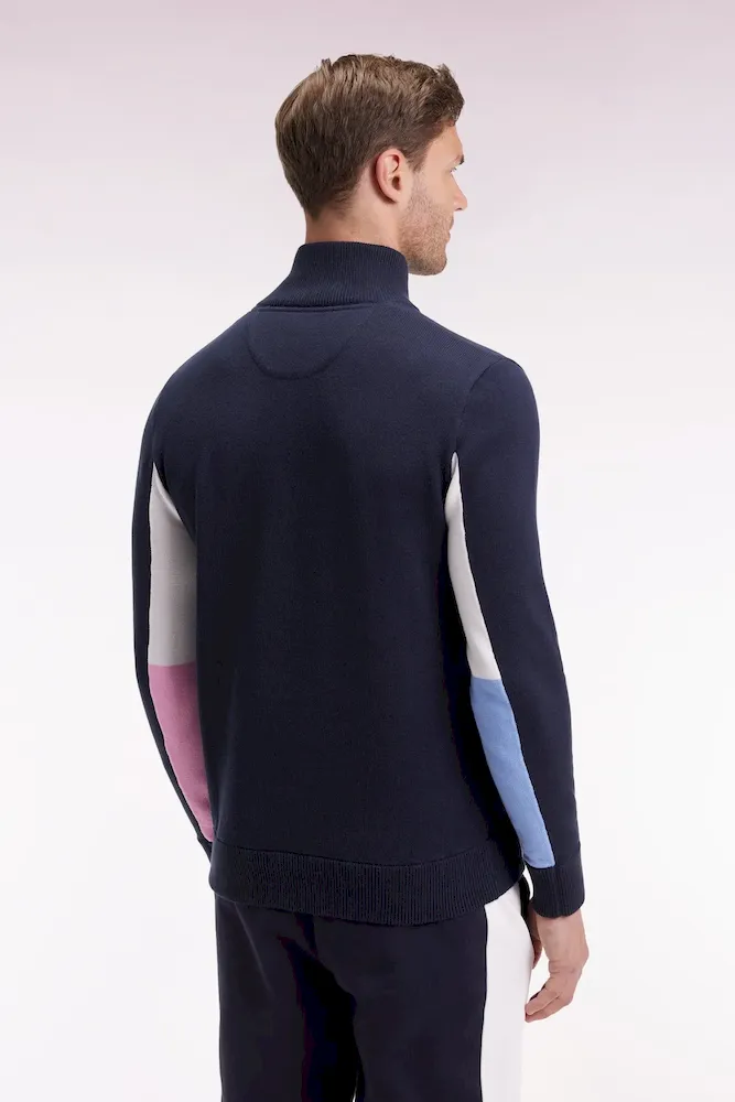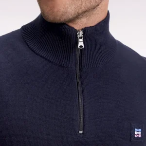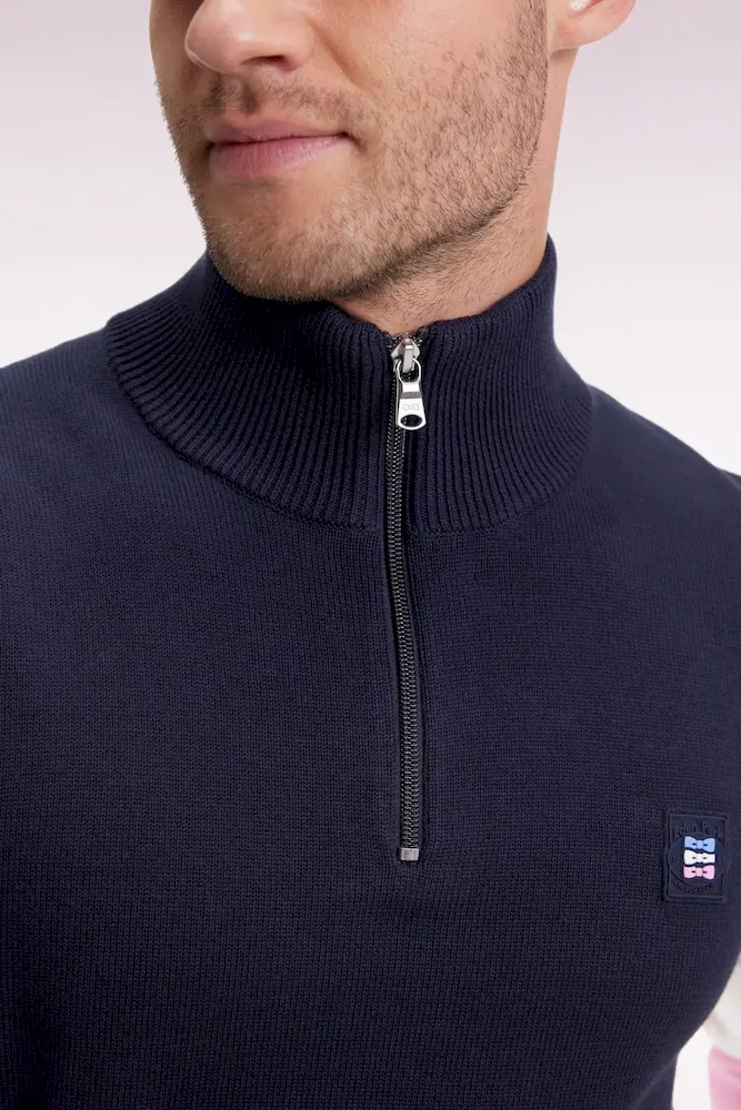 Twist graphique et allure sport-chic pour ce pull à col camionneur zippé, confectionné dans un coton doux. Fidèle à l’esprit Eden Park, ce modèle d’apparence classique se distingue par son remaillage coloré à l’intérieur des manches. Ce colorblock réalisé durant le tricotage est décliné dans une version bleu marine, ciel et bleu roi ou écru, ciel et rose : une alternative typique des codes Eden Park. Sa coupe droite confortable, son col montant zippé à intérieur contrasté et ses finitions soignées, badge gomme sur la poitrine et bords-côtes, font de ce modèle une pièce forte du vestiaire masculin, idéale pour dynamiser les silhouettes du quotidien avec élégance