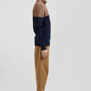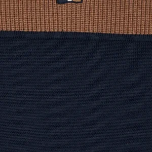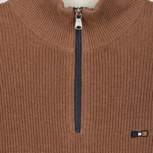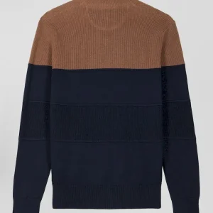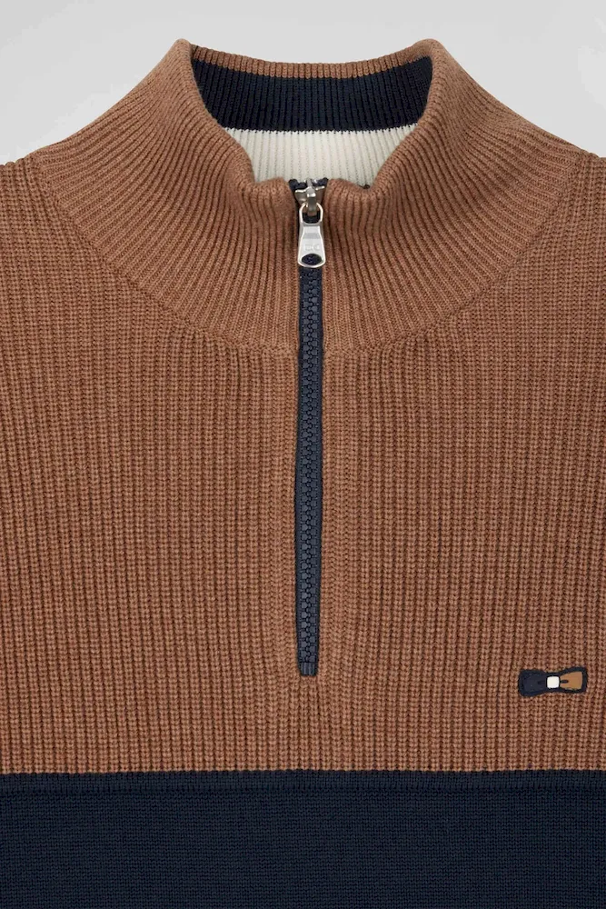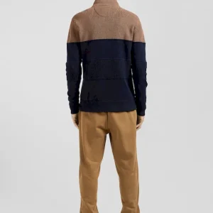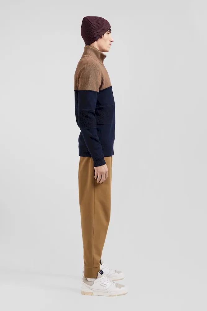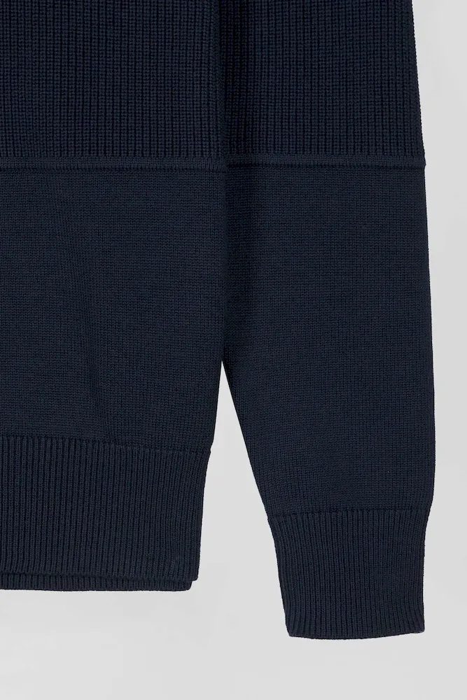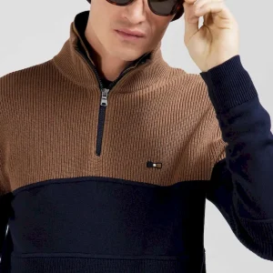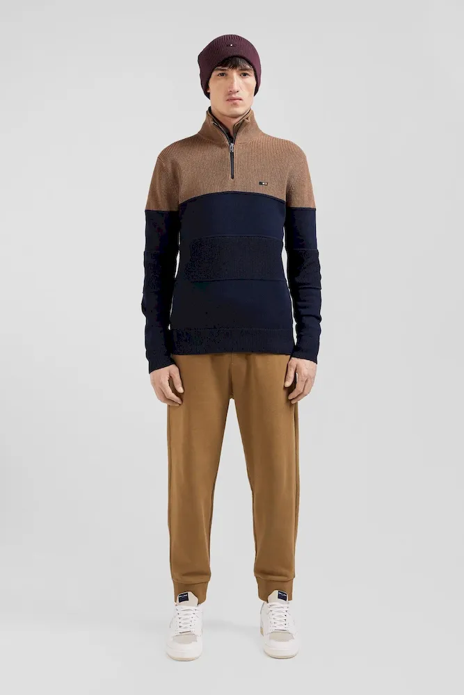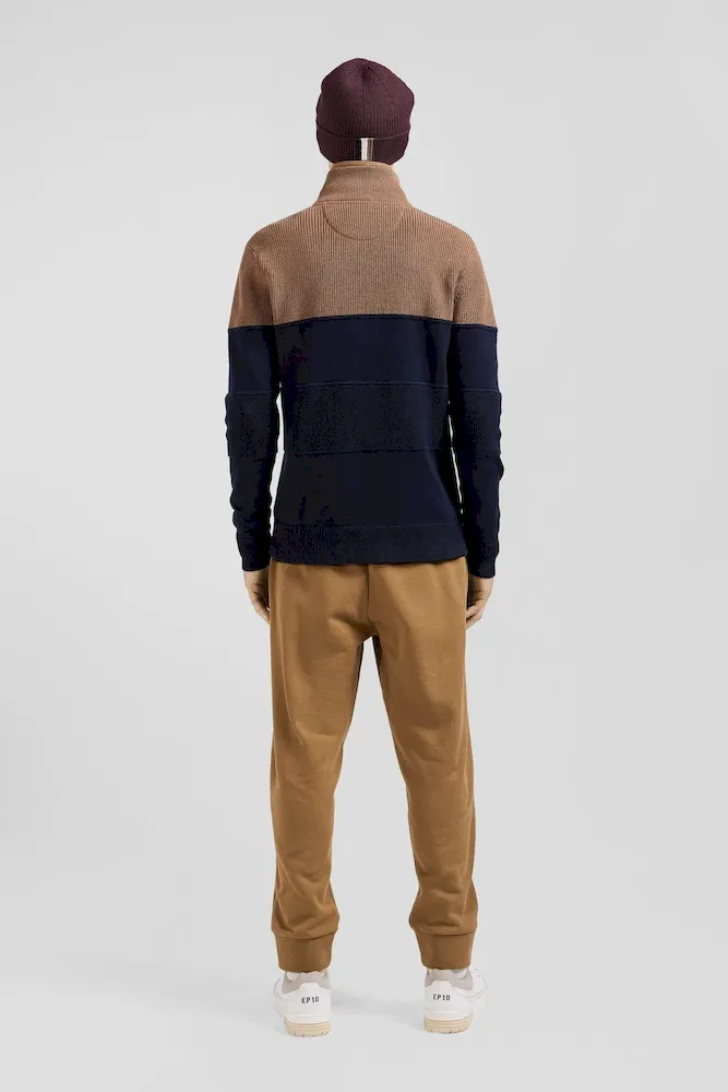 Élégance et originalité se fondent dans ce pull zippé à col camionneur. Ses rayures intérieures contrastées et la demi-lune en jersey sont rehaussées par un ruban tricoté tricolore, pour une touche discrète de sophistication. Le jeu des côtes perlées alternant avec le jersey crée un effet trompe-l’œil saisissant, évoquant un style coupé-cousu contemporain rendant hommage aux maillots de rugby et à leur confection particulière. Cet essentiel masculin revisité est parfait pour une allure raffinée et décontractée à la fois.