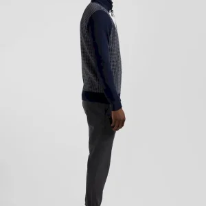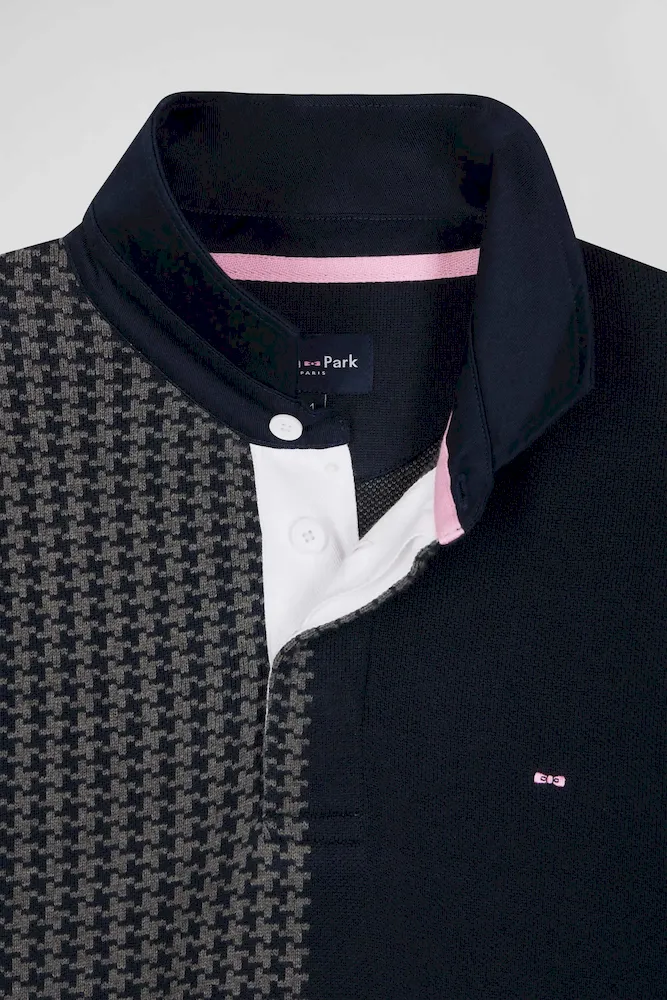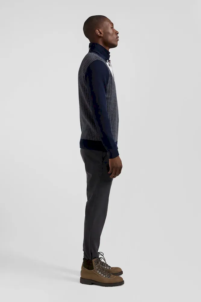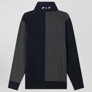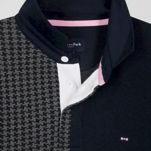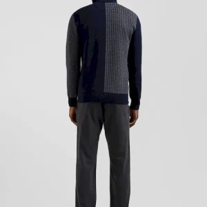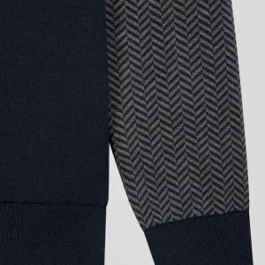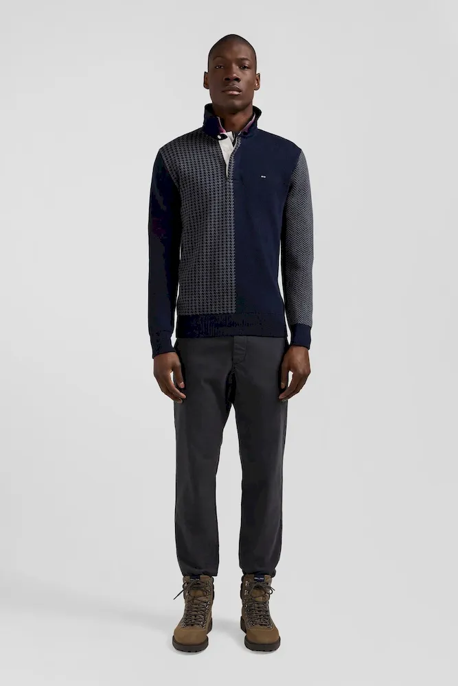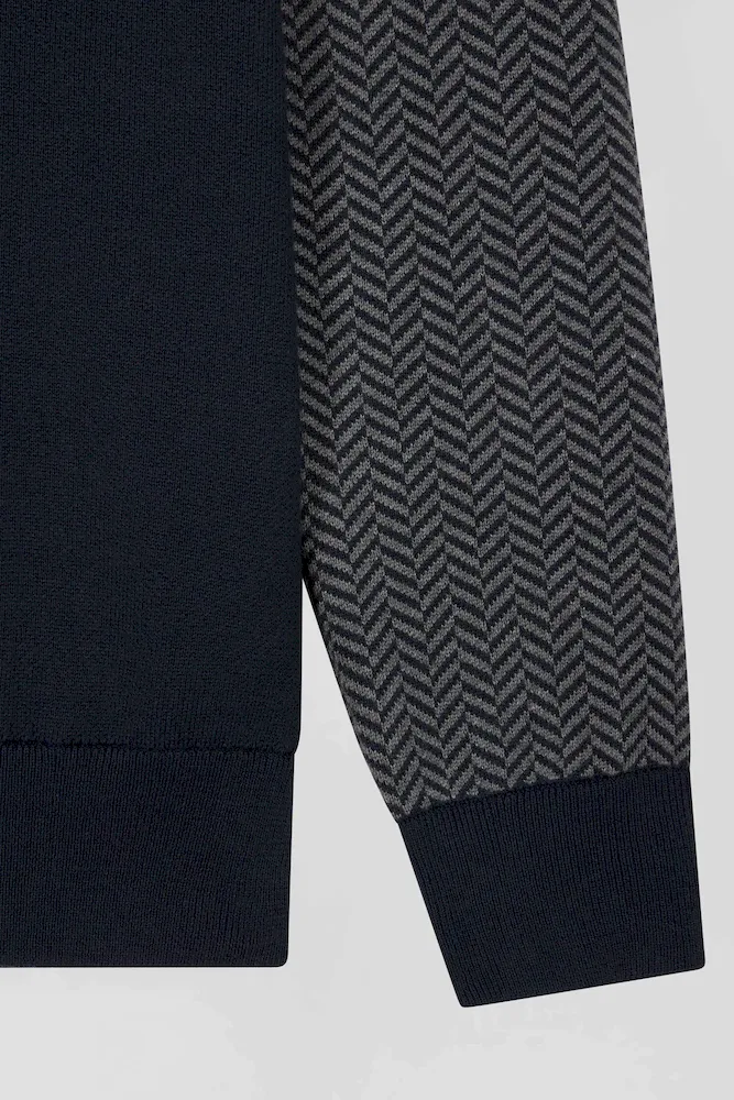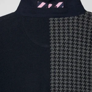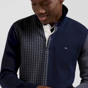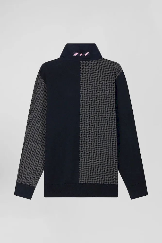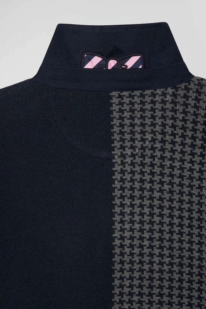 Ce pull homme en coton se distingue par son col maillot en twill, offrant une touche d’élégance sportive. Le design unique du plastron associe harmonieusement une partie en motif pied-de-poule et une autre en maille unie, créant un contraste visuel saisissant. À l’arrière, le col est orné d’une broderie nœud papillon sophistiquée, surmontée d’une application de tissu cravate rayée apportant une finition discrète raffinée.