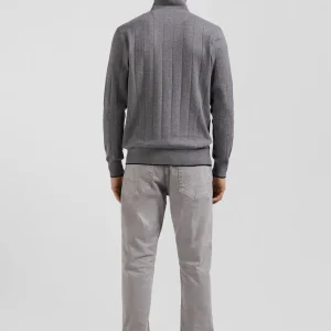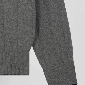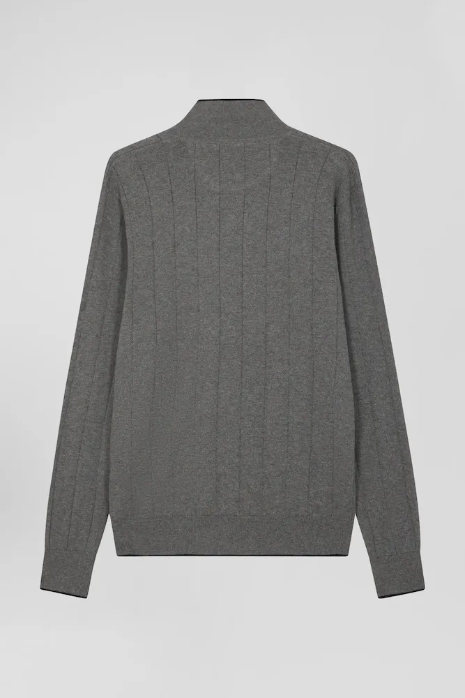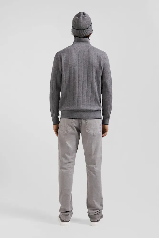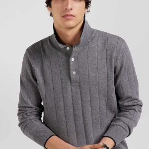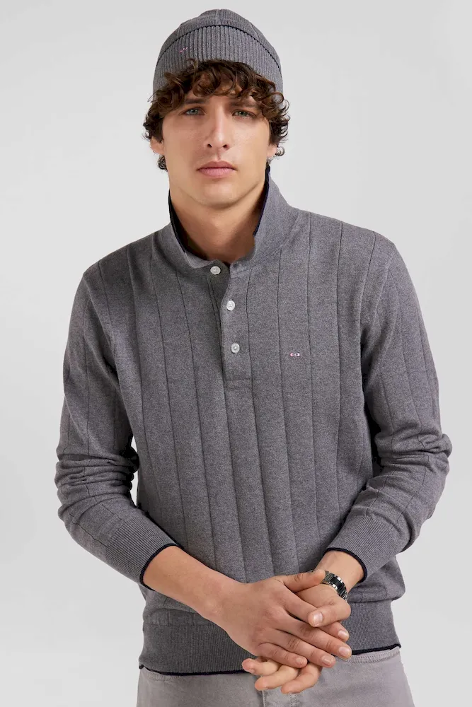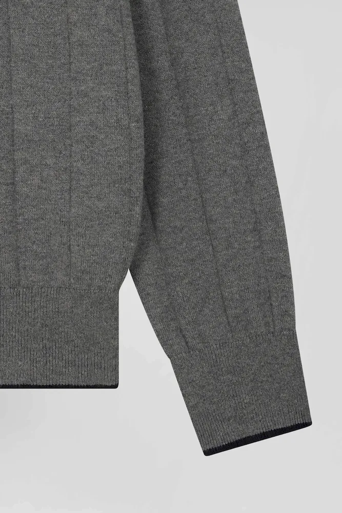 Ce pull col maillot, confectionné à partir d’un mélange de coton et cachemire, offre à la silhouette automne-hiver une touche d’élégance avec son fin liseré contrasté. Le tricotage en côtes plates rend hommage à notre emblématique rayure cerclée de rugby, réinterprétée ici de manière verticale pour une touche moderne. La plaquette de boutonnage, réalisée en ruban tricoté en côtes plates, ajoute une finition soignée à ce pull chaud. Parfait pour ceux qui cherchent à combiner confort et style sophistiqué, ce pull est un choix idéal pour une allure chic et décontractée.