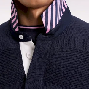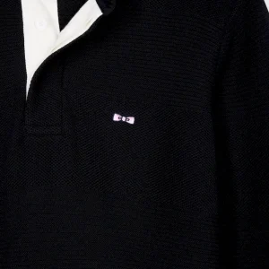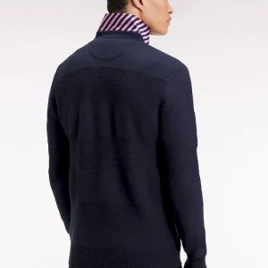 Ce pull à col maillot en coton pur revisite les codes emblématiques de notre maison française avec son tricotage double, nid d’abeille et côtes, jouant sur les textures pour recréer les rayures rugby en ton sur ton. Le dessous de col contrasté en tissu cravate rayé apporte à ce modèle sport-chic une touche d’audace, signature French Flair d’Eden Park. Coupe droite confortable, broderie nœud papillon rose sur la poitrine et finitions soignées complètent cette pièce élégante, pensée pour les plus exigeants