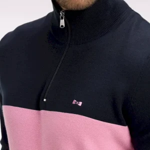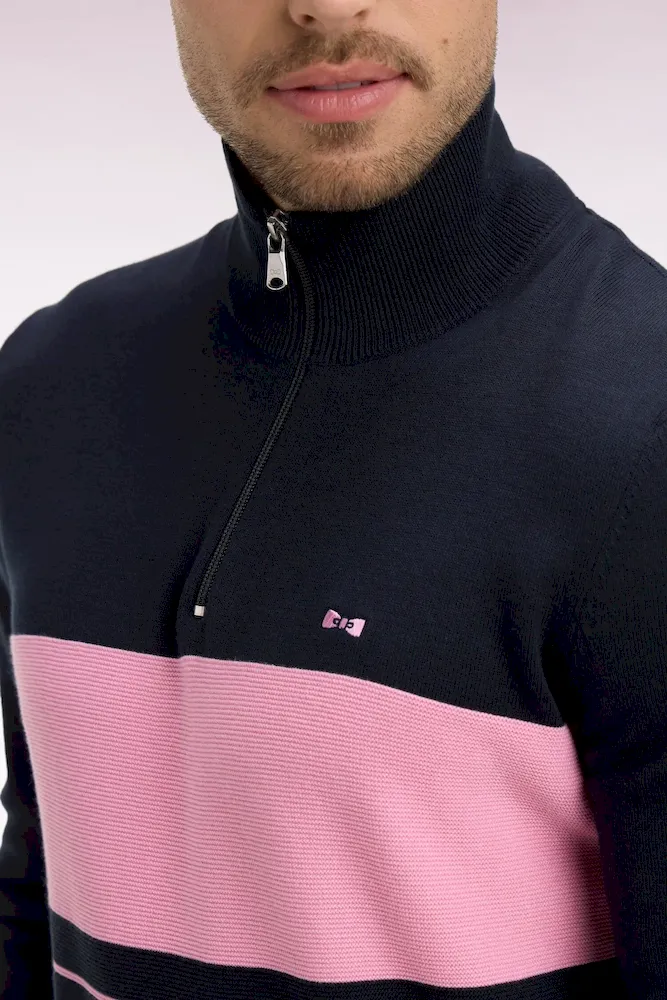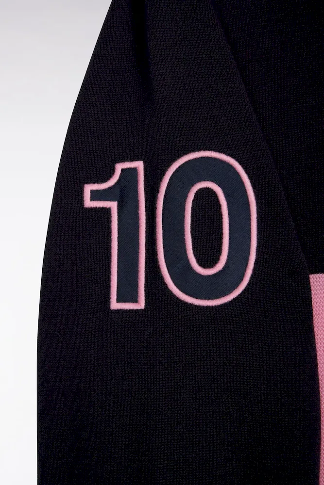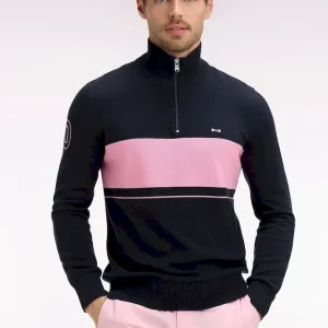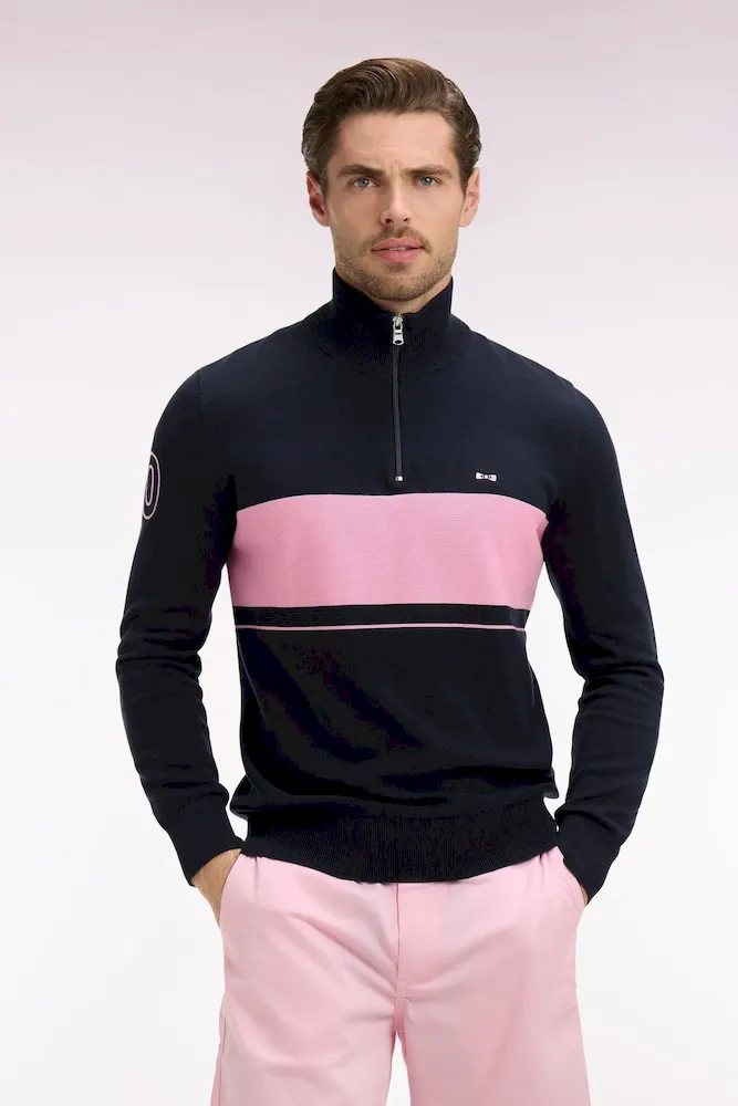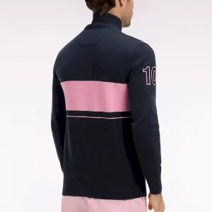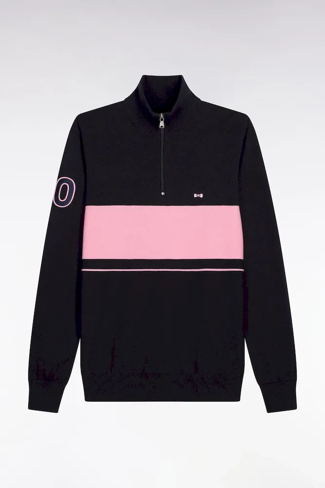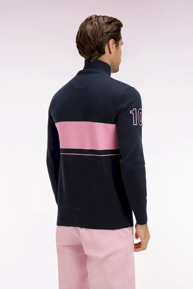 Ce pull à col camionneur revisite un classique du vestiaire masculin avec un jeu subtil de textures et de contrastes. Son tricotage mêle points jersey, envers et Ottoman pour une allure dynamique et contemporaine. L’ouverture zippée frontale et le patch 10 brodé sur la manche rappellent l’héritage rugby de la Maison, tandis que la broderie du nœud papillon sur la poitrine signe cette pièce emblématique de l’esprit French Flair de nos collections de mode.
