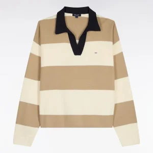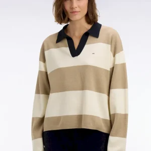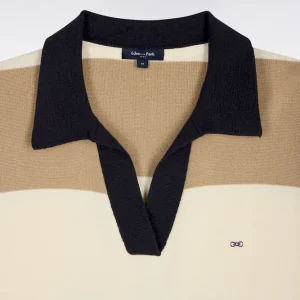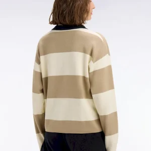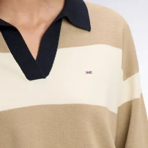 Ce pull à col polo en maille milano marine dense et élégante, revisite le style marin avec ses rayures beige et blanc qui apportent relief et structure. Le col polo et l’encolure contrastée accentuent son raffinement, tandis que le nœud papillon brodé signe la pièce avec subtilité. Idéal pour des looks raffinés, ce pull femme se porte aussi bien avec un pantalon blanc qu’avec un jean brut pour une silhouette moderne et lumineuse.