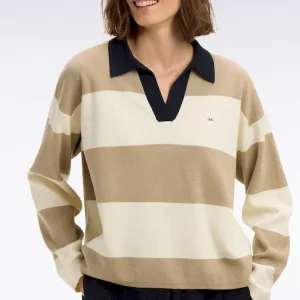 Ce pull à col polo en maille milano marine dense et élégante, revisite le style marin avec ses rayures beige et blanc qui apportent relief et structure. Le col polo et l’encolure contrastée accentuent son raffinement, tandis que le nœud papillon brodé signe la pièce avec subtilité. Idéal pour des looks raffinés, ce pull femme se porte aussi bien avec un pantalon blanc qu’avec un jean brut pour une silhouette moderne et lumineuse.