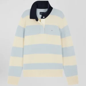 Pull col polo en laine et cachemire rayé bleu et écru